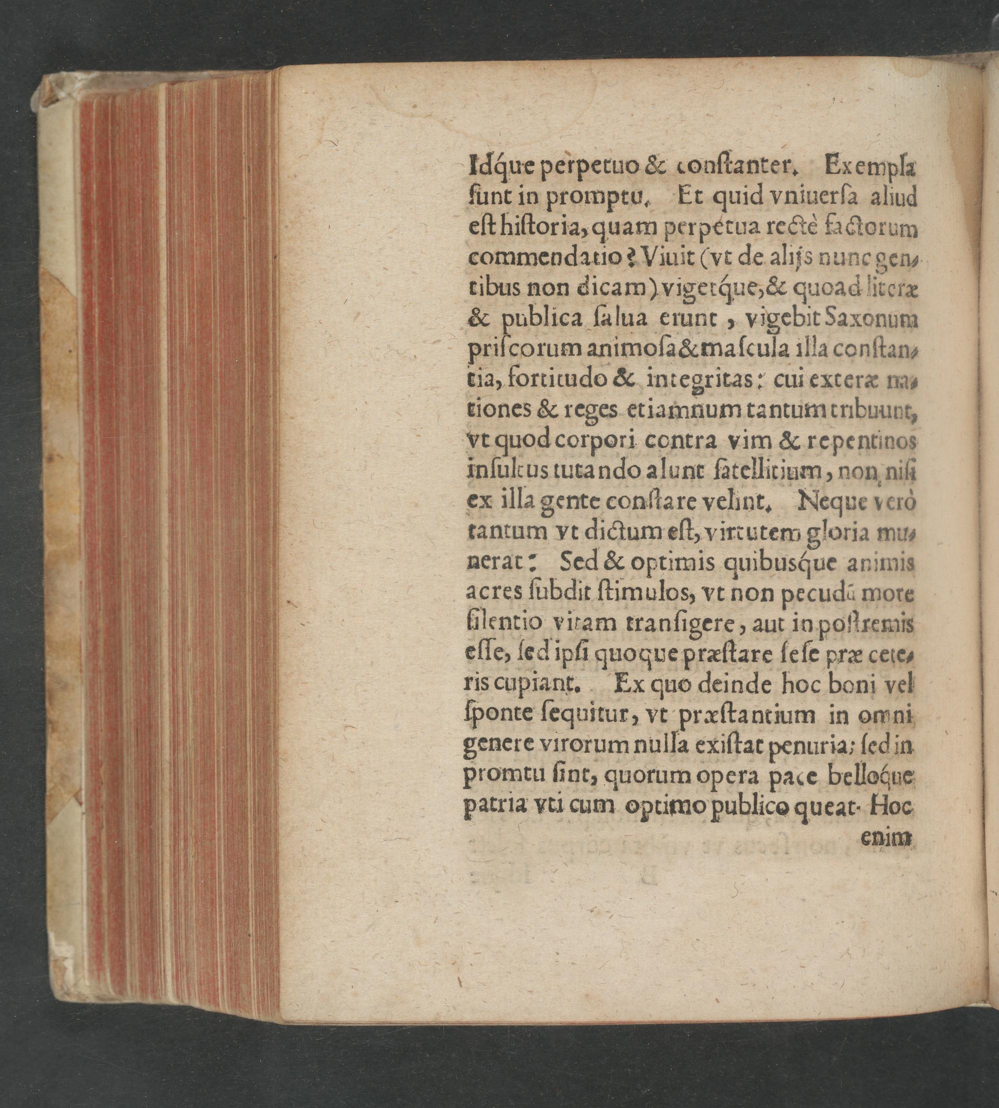 Idque perpetuo& conſtanter. Exempla ſunt in promptu. Et quid vniuerſa aliud eſt hiſtoria, quam perpetua rectè fatorum commendatio? Viuit(vt de alijs nunc gen⸗ tibus non dicam) vigetque,& quoad literæ & publica ſalua erunt, vigebit Saxonum priſcorum animoſa& maſcula illa conſtan- tia, fortitudo& integritas: cui exteræ na⸗ tiones& reges etiamnum tantumtnbuunt, vt quod corpori contra vim& repentinos inſultus tutando alunt ſatellirjium, non niſt ex illa gente conſtare vehnt. Neque verò tantum vt dictum eſt, virtutem gloria mu⸗ nerat: Sed& optimis quibusque animis acres ſubdit ſtimulos, vt non pecudũ more lilentio vitam tranſigere, aut in poſſremis eſſe, ſe d ipſi quoque præſtare ſeſe præ ceie- ris cupiant. Ex quo deinde hoc boni vel ſponte ſequitur, vt præſtantium in omni genere virorum nulla exiſtat penuria; ſedin Promtu ſint, quorum opera pace belloquc patria vti cum optimo publico queat Hoc enim