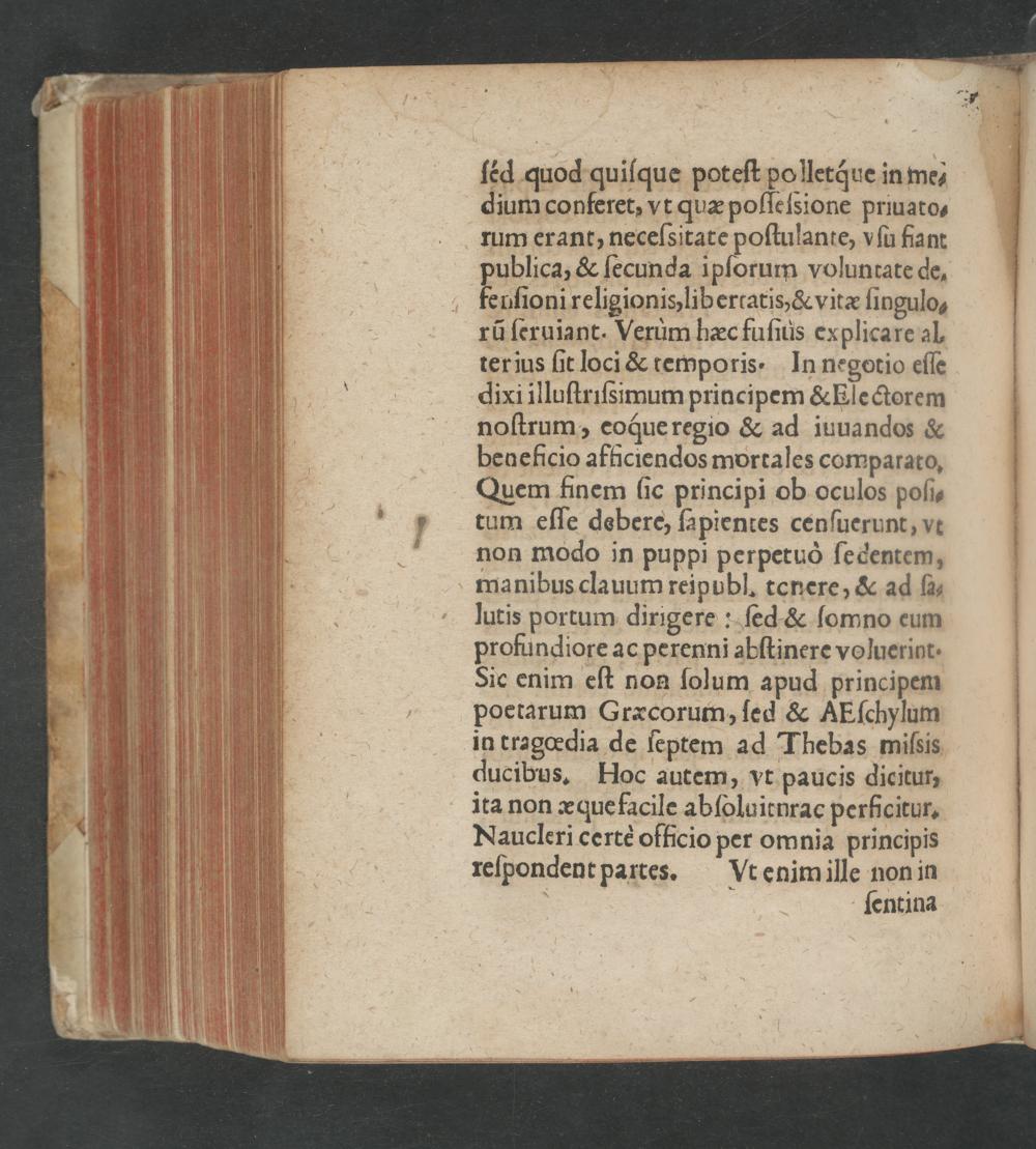 ter ius ſit loci& temporis- In negotio eſſe dixi illuſtriſsimum principem& Eſe ctorem noſtrum, coque regio& ad iuuandos& beneficio afficiendos mortales comparato, Quem finem ſic principi ob oculos poſi⸗ tum eſſe debere, ſapientes cenſuerunt, vt non modo in puppi perpetuò ſedentem, manibus clauum reipubl. tenere,& ad ſa- lutis portum dirigere: ſed& ſomno eum profundiore ac perenni abſtinere voluerint- Sic enim eſt non ſolum apud principem poetarum Græcorum, ſed& AEſchylum in tragœdia de ſeptem ad Thebas miſsis ducibus. Hoc autem, vt paucis dieitur, ita non æ que facile abſoluitnrac perficitur. Naucleri certè officio per omnia principis reſpondent partes. Yt enim ille non in b ſentina