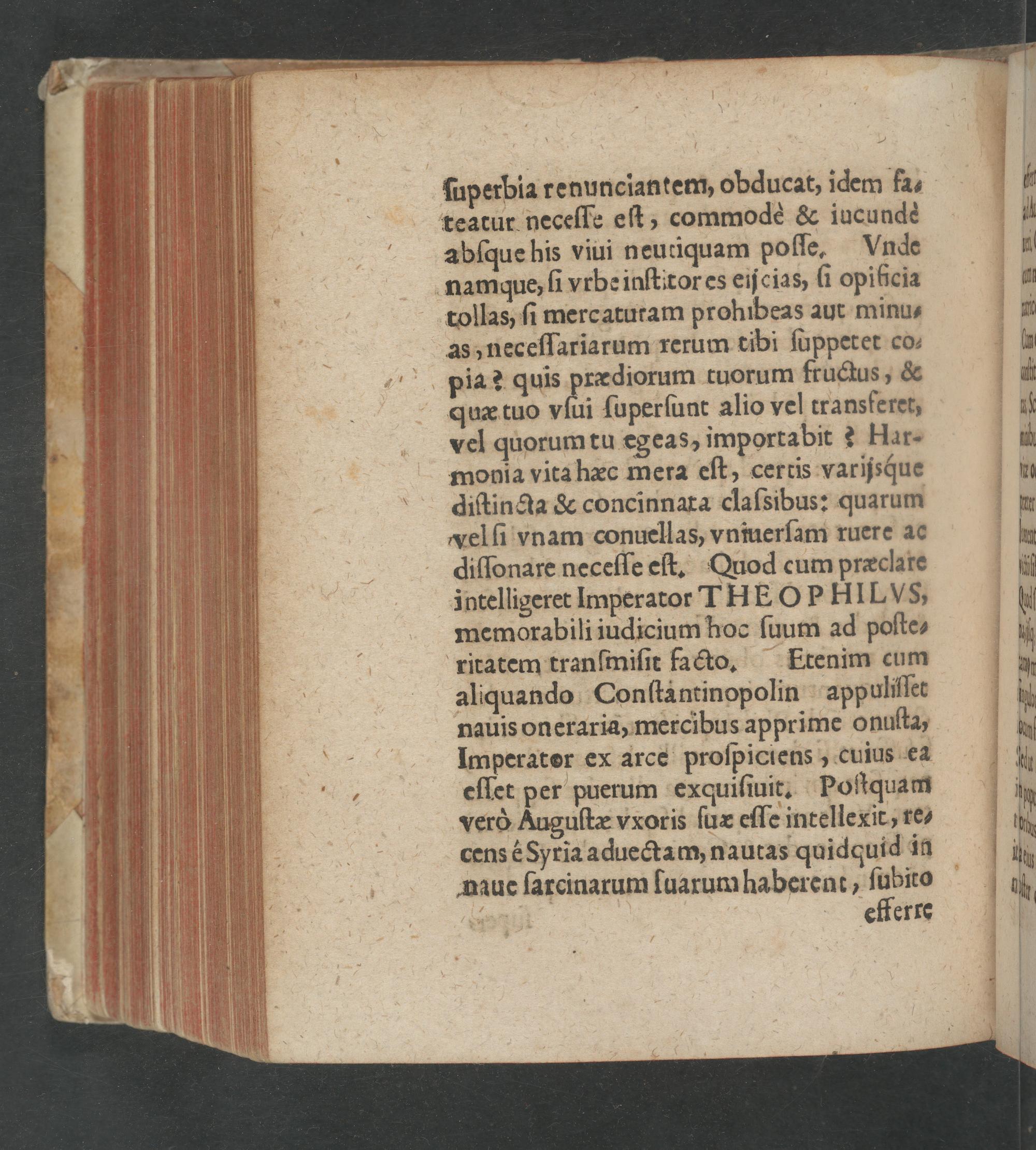 ſuperbia renunciantem, obducat, idem fa⸗ teatur neceſſe eſt, commodè& iucundè abſque his viui neutiquam polſſe, Vnde namque, ſi vrbe inſtitor es eiſcias, ſi opificia tollas, ſi merc aturam prohibeas aut minu- as, neceſſariarum rerum tibi ſuppetet co- pia? quis prædiorum tuorum fructus,& quæ tuo vſui ſuperſunt alio vel transferet, vel quorumtu egeas, importabit? Har- monia vita hæc mera eſt, certis varijsque diſtinqa& concinnara claſsibus: quarum velſi vnam conuellas, vniuerſam ruere ac diſſonare neceſſe eſt. Quod cum præclare intelligeret Imperator THEOP HILVS, memorabili iudicium hoc ſuum ad poſte- ritatem tranſmiſit facto. Etenim cum aliquando Conſtantinopolin appuliſſet nauis oneraria, mercibus apprime onuſta, Imperater ex arce proſpiciens, cuius ea eſſet per puerum exquiſiuit. Poſtquam verò Auguſtæ vxoris ſux eſſe intellexit, re- cens Syria aduectam, nautas quidquid in naue ſarcinarum ſuarum haberent, ſi ubito