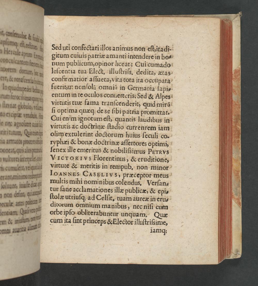 Sed uti confectari illos animus non eſt itadi- gitum cuiuis patriæ amanti intendere in bo⸗- num publicum, opinor hceat: Cui cumado leſcentia tua Elect. illuſtriſs. dedita, ætas- confrrmatior aſſueta, vita tota ita occupata- fuerit,u: nonſolã omnià in Germania ſapi⸗ entum in te oculos conuerteris: Sed& Alpes virtutis tuæ fama tranſcenderit, quid mirã- ſi optima quæq; de se ſibi patria promittat. Cui enim ignotum eſt, quantis laudibus in virtutis ac doctrinæ ſtadio currenrem iam olim extulerint doctorum huius ſeculi co. ryphæi& bonæ doctrinæ aſſertores optimi, ſenex ille emeritus& nobiliſsimus PErRVS VICTORIyS Florentinus,& eruditione, virtute& meritis in rempub, non minor IoANNES CASELIVS, præceptor meus multis mihi nominibus colendus, Verſan-