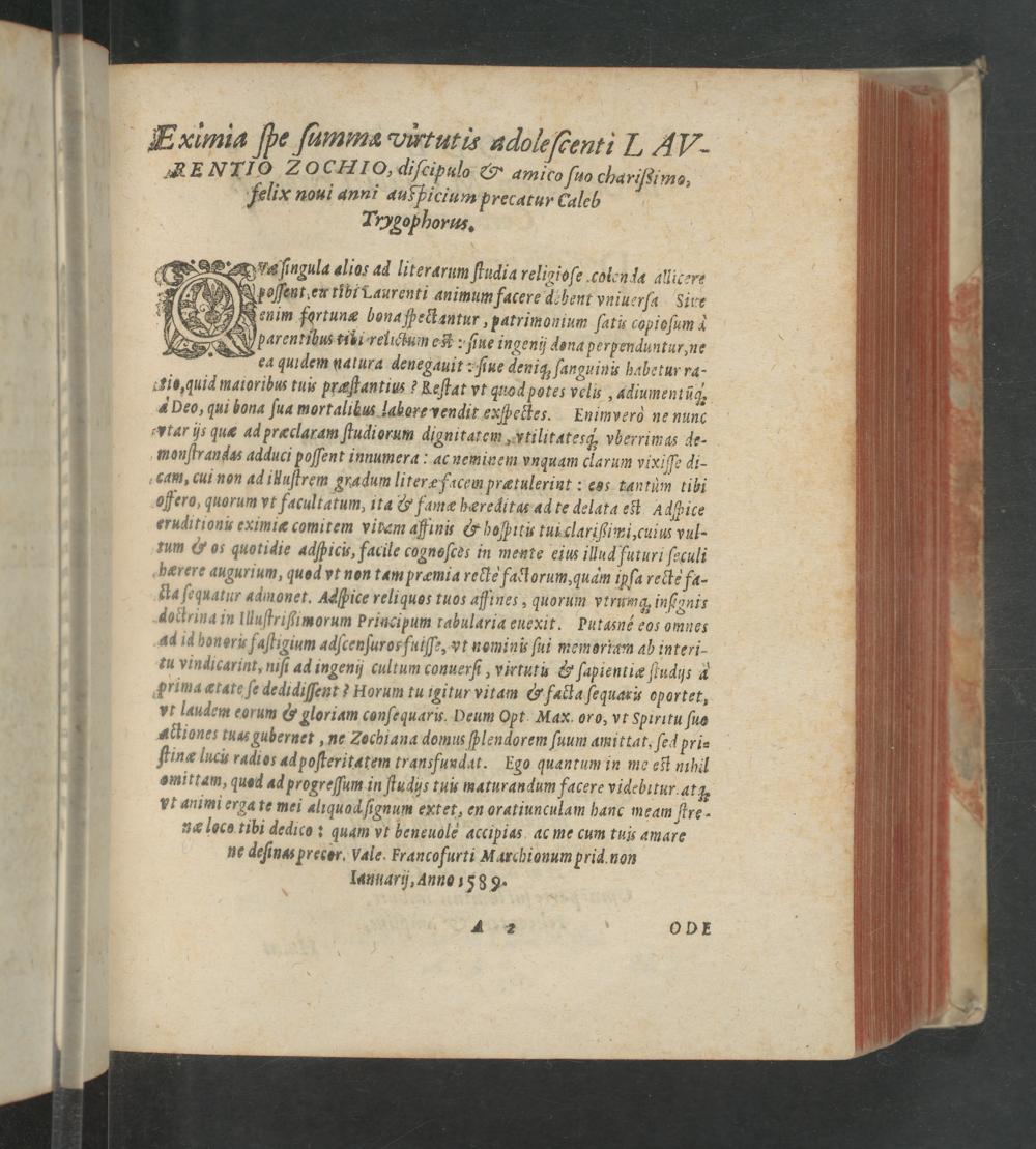 Eximia ſpe ſumma vurtutis adoleſcenti L AV RENTIO ZOCHMIO, diſcipulo& amico ſuo chariſsimo, Felix noui anni aufpicium precatur Culeb Tyygophorus.