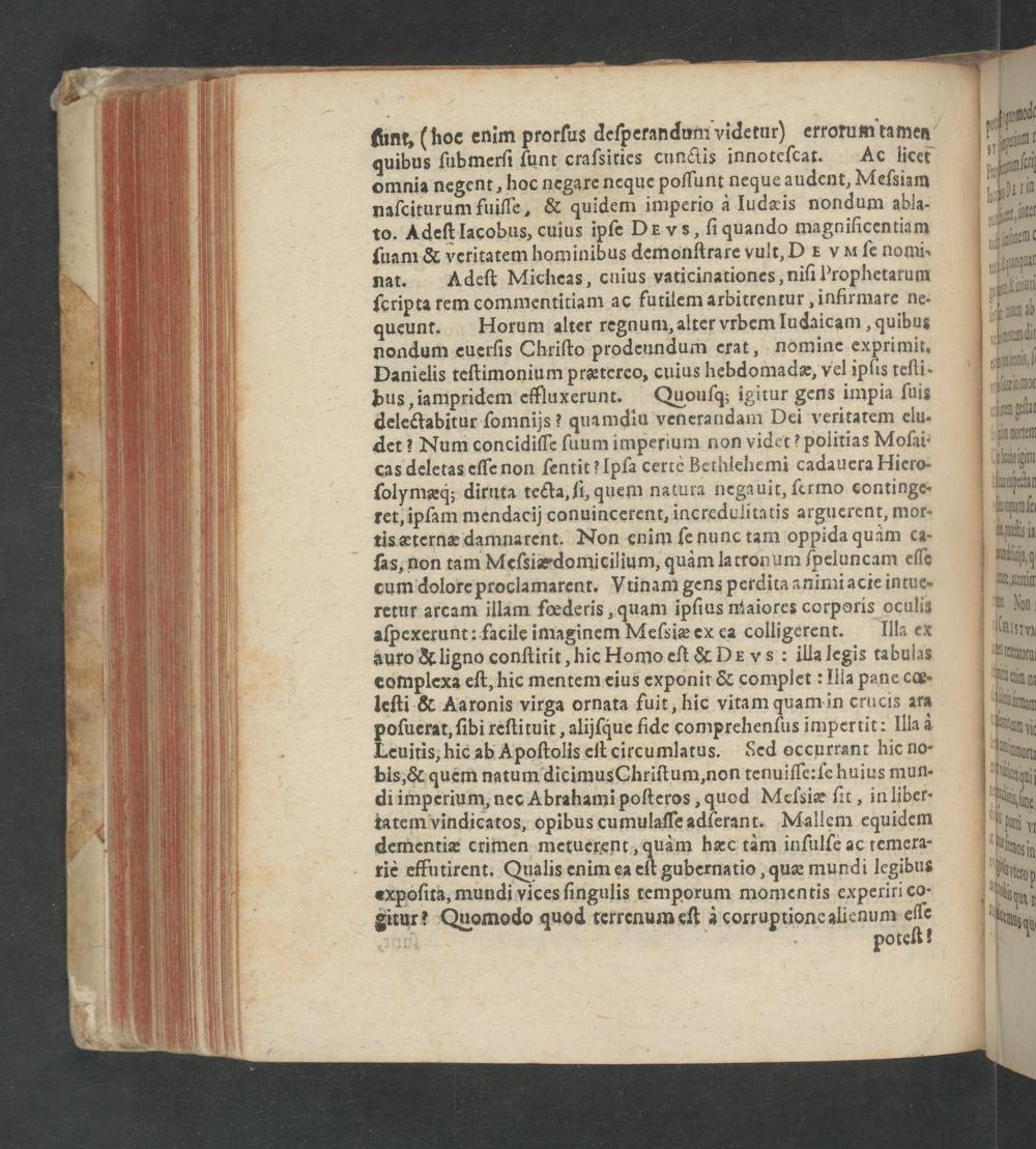 omnia negent, hoc negare neque poſſunt neque audent, Meſsiam naſciturum fuiſſe,& quidem imperio à Iudæis nondum abla. to. Adeſt lacobus, cuius ipſe DEvs, ſi quando magniſicentiam ſuam& veritatem hominibus demonſtrare vult, DE vM ſe nomi: nat. Adeſt Micheas, cuius vaticinationes, niſi Prophetarum ſcripta rem commentitiam ac futilem arbitrentur„infirmare ne- queunt. Horum alter regnum, alter vrbem ludaicam, quibus nondum cuerſis Chriſto prodeundum erat, nomine exprimit. Danielis teſtimonium prætereo, cuius hebdomadæ, vel ipſis teſti- pus, iampridem effluxerunt. Quouſq; igitur gens impia ſuis delectabitur ſomnijs? quamdiu venerandam Dei veritatem elu- det: Num concidiſſe ſuum imperium non videt? politias Moſai- cas deletas eſſe non ſentit? Ipſa certè Bethlehemi cadauera Hiero- ſolymæq́; diruta tecta, ſi, quem natura negauit, ſermo continge ret, ipſam mendacij conuincerent, incredulitatis arguerent, mor- tis æternæ damnarent. Non enim ſe nunc tam oppida quàm ca- ſas, non tam Meſsiæ domicilium, quàm latronum ſpeluncam eſſe cum dolore proclamarent. Vtinam gens perdita animi acie intue- retur arcam illam fœderis, quam iĩpſius maiores corporis oculis aſpexerunt: facile imaginem Meſsiæ ex ea colligerent. Illa ex auro& ligno conſtitit, hic Homo eſt& DEvs: illa legis tabulas complexa eſt, hic mentem eius exponit& complet: Illa pane cœ-