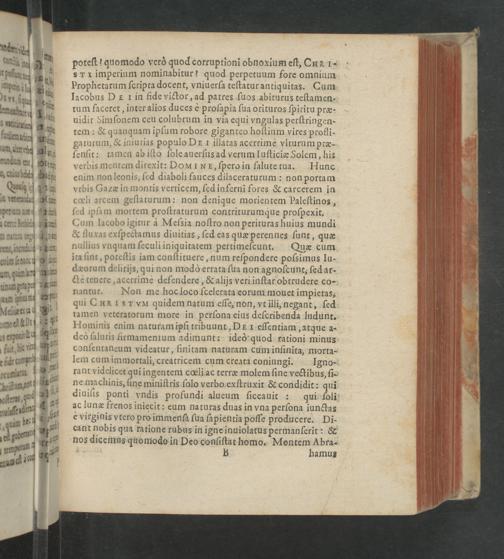 poteſt? quomodo verò quod corruptioni obnoxium eſt, Cus 1. sr. imperium nominabitur? quod perpetuum fore omnium Prophetarum ſcripta docent, vniuerſa teſtatur antiquitas. Cum Iacobus D E 1 in fide victor, ad patres ſuos abiturus teſtamen- tum faceret, inter alios duces& proſapia ſua orituros ſpiritu præ- uidit Simſonem ceu colubrum in via equi vngulas perſtringen- tem:& quanquam ipſum robore giganteo hoſtium vires profli- gaturum,& iniurias populo DE 1 illatas acerrime vlturu m præ- ſenſit: tamen ab iſto ſole auerſus ad verum luſticiæ Solem, his verbis mentem direxit: DoMi NE, ſpero in ſalute tua. Hunc enim non leonis, ſed diaboli fauces dilaceraturum: non portam vrbis Gazæ in montis verticem, ſed iaferni fores& carcerem in cœli arcem geſtaturum: non denique morientem baleſtinos, ſed ipſam mortem proſtraturum contriturumq́ue proſpexit. Cum lacobo igitur à Meſsia noſtro non perituras huius mundi & fluxas exſpectamus diuitias, ſed eas quæ perennes ſunt, quæ nullius vnquam ſeculi iniquitatem pertimeſcunt. Quæ cum ita ſint, poteſtis iam conſtituere, num reſpondere poſsimus lu- dæorum delirijs, qui non modò errata ſua non agnoſcunt, ſed ar- te tenere, acerrime defendere,& alijs veri inſtar obtrudere co- nantur. Non me hoc loco ſcelerata eorum mouet impietas, qui CnKIST VM quidem natum eſſe, non, vt illi, negant, ſed tamen veteratorum more in perſona eius deſcribenda ludunt. Hominis enim naturam ipſi tribuunt, DEI eſſentiam, atque a- deò ſalutis firmamentum adimunt: ideò quod rationi minus conſentaneum videatur, ſinitam naturam cum infinita, morta- lem cum immortali, creatricem cum creata coniun gi. Igno- rant videlicet qui ingentem cœli ac terræ molem ſine vectibus, ſi- ne machinis, ſine miniſtris ſolo verbo exſtruxit& condidit: qui diuiſis ponti vndis profundi alueum ſiccauit: qui ſoli ac lunæ frenos iniecit: eum naturas duas in vna perſona iundas evitginis vtero pro immenſa ſua ſapientia poſſe producere. Di- cant nobis qua ratione rubus in igne inuiolatus permanſerit:& nos dicemus quomodo in Deo conſiſtat homo. Montem Abra- B hamus