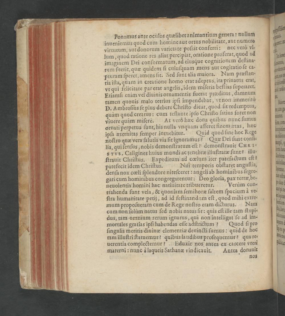 ponamus ante ocuſos quælibet animantium genera: nullum jaueniemus quod cum homine aut ortus nobilitate, aut numero virtutum, aut donorum varietate poſsit conferri: nec verò vl lum, quod ratione res alias percipiat, oratione proferat, quod ad imaginem Dei conformatum, ad eiusque cognitionem deſtina- tum fuerit, quæ quidem ſi cuiuſquam mens aut cogitatio ſe ca- pturam ſperet, amens ſit. Sed ſunt alia maiora. Nam præſtan- tia iſta, quam in creatione homo etat adeptus, ita priuatus erat, vt qui felicitate par erat angelis, idem miſeria beſtias ſuperaret. Etiamſi enim vel diuinis ornamentis fuerat preditus, damnum tamen quouis malo tetrius ipſi impendebat, vtnon immerito D. Ambroſius ſe plus debere Chriſto dicat, quod ſit redemptus, quàm quod creatus: cum teſtante ipſo Chriſto ſatius foret non viuere quàm miſere. At verò hæc dona quibus nunc ſumus ornati perpetua ſunt, his nulla vnquanm afferet finem ætas, hæc ipſa æternitas ſemper intnebitur. Quid quod ſine hoc Kege noſtro quæ vera ſalutis via ſit ignoramus? Quæ Dei ſunt conſi lia, qui fenſus, nobis demonſtratum eſt? demonſtrauit CHk I- s rvs. Caligines huius mundi actenebræ illuſtratæ ſunt? illu- ſtrauit Chriftus. Expeditum ad cœlum iter patefactum eſt? patefecit idem Chriſtus. Niſi temporis obſtaret anguſtia, denſa nox cœli ſplendore niteſceret: angeli ab hominibus ſegre- gati cum hominibus congregarentur: Deo gloria, pax terræ, be- neuolentia homini hac natiuitate tribueretur. Verùm con- trahenda ſunt vela,& quoniam ſemihoræ ſaltem ſpacium à ve- ſtra humanitate petij, ad id feſtinandam eſt, quod mihi extre- mum propoſueram cum de Kege noſtro eram dicturus. Nam cum non ſolùm natus ſed nobis natus ſit: quis eſt ille tam ſtupi- dus, tam omnium rerum ignarus, qui non intelligat ſe ad im- mortales gratias ipſi habendas eſſe adſtrictum? Quod ſi pro ſingulis meritis diuinæ clementiæ deuincti ſumus: quid de hoc tam illuſtri ſtatuemus? quibus laudibus proſequemur? qua re- uerentia complectemur? Eduxit nos antea ex carcere vteri materni: nunc à laqueis Sathanæ vindicauit. Antca donauit 05