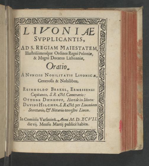 KRarxHOLDO BRAKEIL, ERMESSENSI Capitaneo, J. R. eMdl. Camtrario: OrroRE DœuHoFF, Herede in Hawen. Davior HiLcHEN, S. ReM. per Liuoniam Scorctario,& Notario terreſtri Liuon.