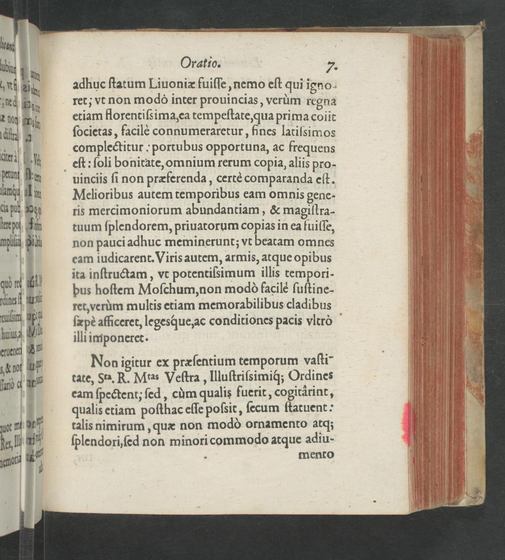 Oratio.„. adhuc ſtatum Liuoniæ fuiſſe, nemo eſt qui igno- ret; vt non modoò inter prouincias, verùm regna etiam florentiſsima, ea tempeſtate, qua prima coiit ſocietas, facilè connumeraretur, hnes latiſsimos complectitur portubus opportuna, ac frequens eſt: ſoli bonitate, omnium rerum copia, aliis pro- uinciis ſi non præferenda, certè comparanda eſt. Melioribus autem temporibus eam omnis gene- ris mercimoniorum abundantiam,& magiſtra- tuum ſplendorem, priuatorum copias in ea fuiſſe, non pauci adhuc meminerunt; vt beatam omnes eam iudicarent. Viris autem, armis, atque opibus ita inſtructam, vt potentiſsimum illis tempori- bus hoſtem Moſchum, non modò facilè ſuſtine- ret, verùm multis etiam memorabilibus cladibus ſæpè afficeret, legesque, ac conditiones pacis vltro ill imponeret.