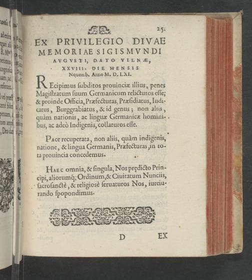 .H. EN PRIVILEGIO DIVAE MEMORIAESIGISMVNPDI äAVGVSTI, DATO VILNE, XXVIII. OIE MENRNSIS
