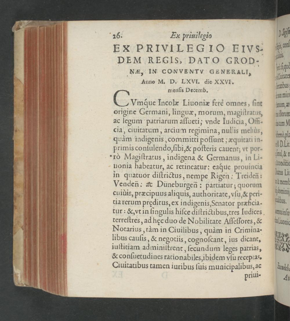 menfis Decemb. b ( mꝗue Incolæ Liuoniæ ferè omnes, ſint origine Germani, linguæ, morum, magiſtratus, ac legum patriarum aſſueti; vnde Iudicia, Offi- cia, ciuitatum, arcium regimina, nuliis mehus, quàm indigenis, committi poſſunt; æquitati in- primis conſulendo, ſibi,& poſteris cauent; vt por- rô Magiſtratus, indigena& Germanus, in Li-