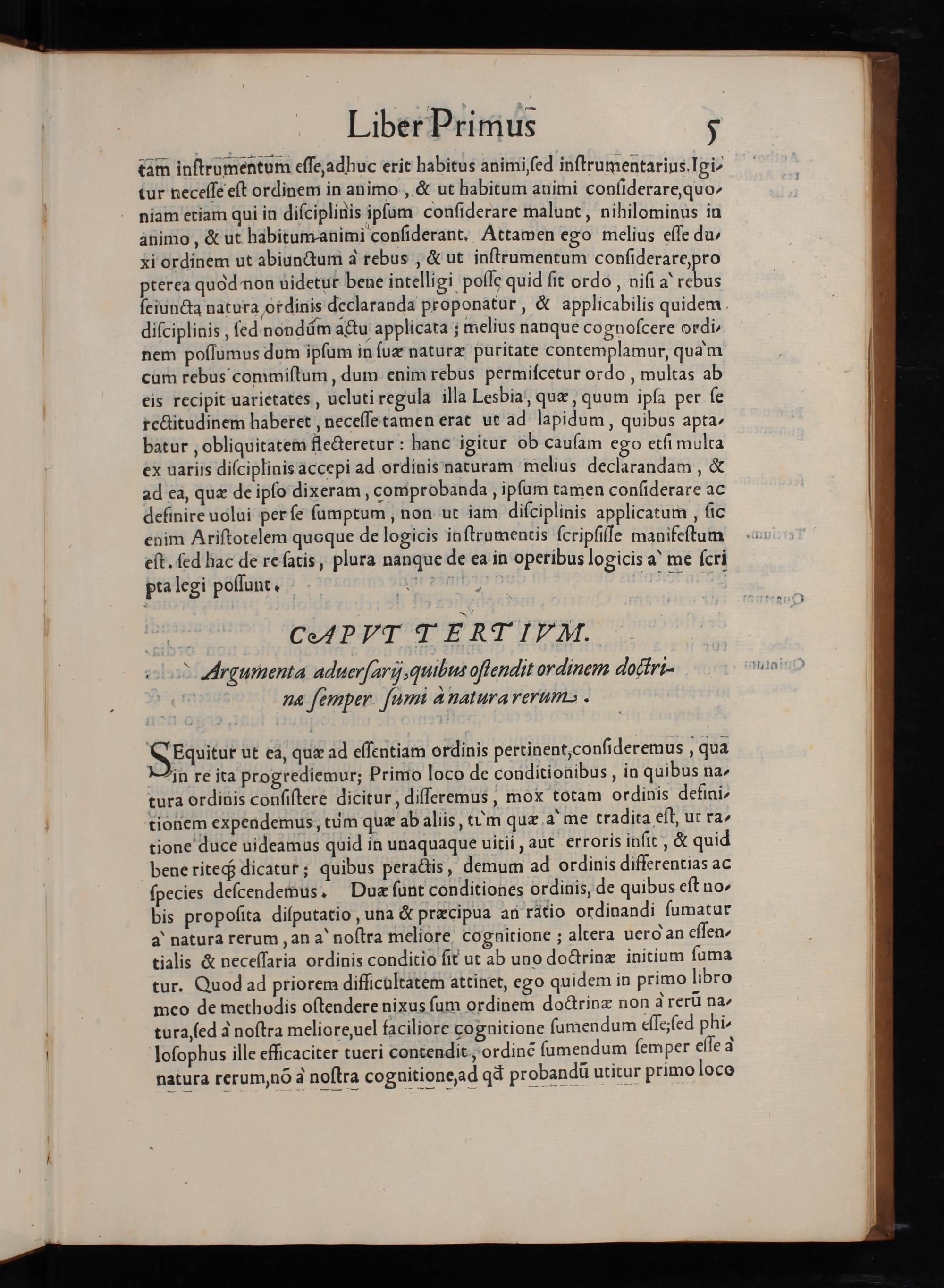 Liber Primus 5 tam inſtrumentum eſſe, adhuc erit habitus animi ſed inſtrumentarius. Igi- tur neceſſe eſt ordinem in animo,& ut habitum animi conſiderare, quo- niam etiam qui in diſciplinis ipſum conſiderare malunt, nihilominus in animo,& ut habitum animi conſiderant. Attamen ego melius eſſe du- xi ordinem ut abiunctum à rebus,& ut inſtrumentum conſiderare, pro pterea quòd non uidetur bene intelligi poſſe quid ſit ordo, niſi a rebus ſeiuncta natura ordinis declaranda proponatur,& applicabilis quidem diſciplinis, ſed nondũm actu applicata; melius nanque cognoſcere ordi nem poſſumus dum ipſum in ſuæ naturæ puritate contemplamur, quam cum rebus commiſtum, dum enim rebus permiſcetur ordo, multas ab eis recipit uarietates, ueluti regula illa Lesbia, quæ, quum ipſa per ſe rectitudinem haberet, neceſſe tamen erat ut ad lapidum, quibus apta- batur, obliquitatem flecteretur: hanc igitur ob cauſam ego etſi multa ex uariis diſciplinis accepi ad ordinis naturam melius declarandam,& ad ea, quæ de ipſo dixeram, comprobanda, ipſum tamen conſiderare ac definire uolui per ſe ſumptum, non ut iam diſciplinis applicatum, ſic enim Ariſtotelem quoque de logicis inſtrumencis ſcripſiſſe manifeſtum eſt. ſed hac de re ſatis, plura nanque de ea in operibus logicis a, me ſcri