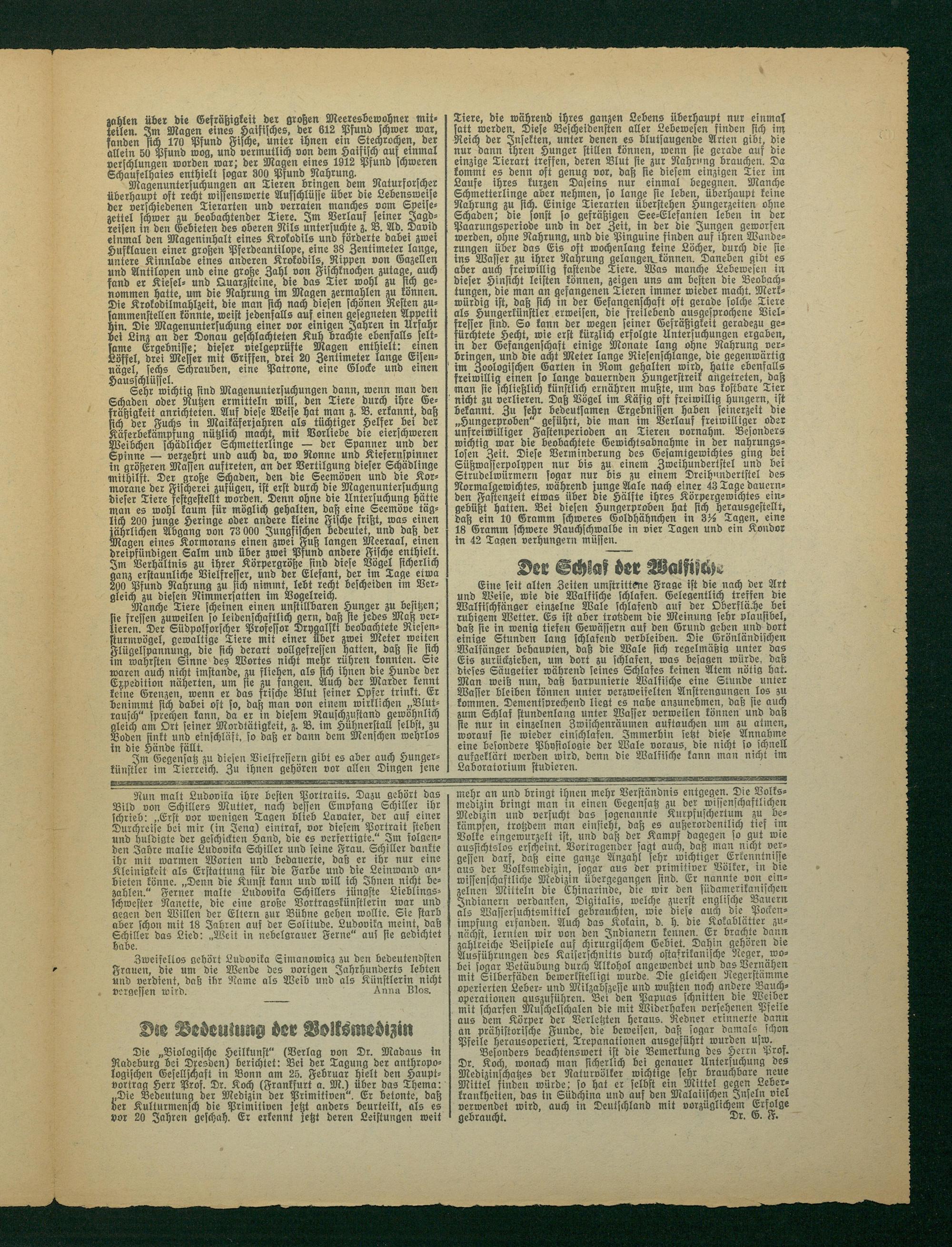 bekannt. Zu ſehr bedeutſamen Ergebniſſen haben ſeinerzeit die „Hungerproben“ geführt, die man im Verlauf freiwilliger oder unfreiwilliger Faſtenperioden an Tieren vornahm. Beſonders wichtig war die beobachtete Gewichtsabnahme in der nahrungs⸗ loſen Zeit. Dieſe Verminderung des Geſamtgewichtes ging bei Süßwaſſerpolypen nur bis zu einem Zweihundertſtel und bei Strudelwürmern ſogar nur bis zu einem Dreihundertſtel des Normalgewichtes, während junge Aale nach einer 43 Tage dauern⸗ den Faſtenzeit etwas über die Hälfte ihres Körpergewichtes ein⸗ gebüßt hatten. Bei dieſen Hungerproben hat ſich herausgeſtellt, daß ein 10 Gramm ſchweres Goldhähnchen in 3 ½ Tagen, eine 18 Gramm ſchwere Rauchſchwalbe in vier Tagen und ein Kondor in 42 Tagen verhungern müſſen.