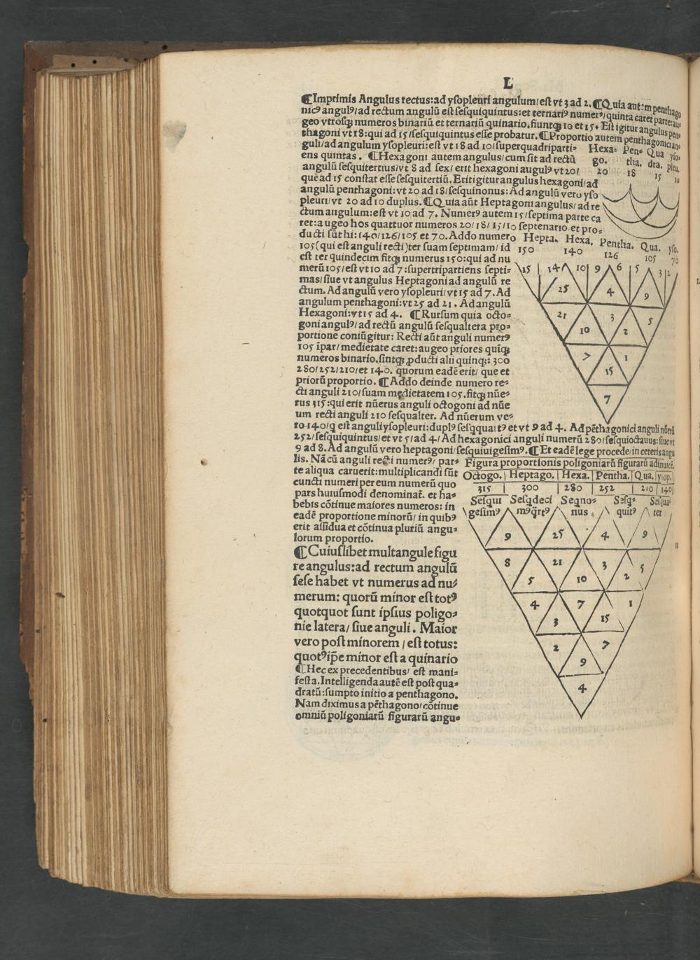 um recti anguli ⁊10 ſeſqualter. Ad nũerum ve⸗ 101404 eſt anguliyſopleuri: duplꝰ ſeſqquaitꝰ et vt 5 ad ʒ. Adpẽthgonicianguliriei vtᷓad ꝓ/ Ad hexagonici anguli numerũ ⁊ go/ſelquioctauus:fuen 9 ad 3. Ad angulũ vero heptagoni ſeſquiuigeſimꝰ. ¶ Et eadẽ lege procede in ceterisang lis. Nã cũ anguli regi numerꝰ/ par⸗ Figura proportionis poligoniar figurarũ ddinuct te aliqua caruerit:multiplicandi ſũt Gctogb. Heptãgo. Hexa. Penthua. Qua ſoh euncti numeri per eum numerũ 10