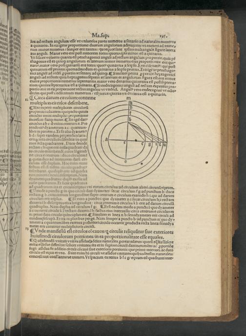 n ¶ Circa datum circulum:continne multiplicescirculos deſcribere. ¶RHecexpetit multiphcem circulorũ proportionalitatem:quopacto quiuis circulus omni multiplici proportione increſcat/ fiatqʒ maior. ¶ Sit igit datꝰ circulus a b c d/cuius centtum e. Pro tendo eiꝰ dyametrum ac quantum⸗ libet in partem c. Et ſit alia dyametrꝰ bd ſuper eandem perpendicularis. eritq; tota citculi circũferẽtia/in quat tuor ſect aquadrantes. Duco deinde rectam c b:que erit coſtaquadrati/daj to circulo inſcrihendi.cuius lõgitudi ne/ circa e centrum: duco circulum᷑ g· quemdico ad interiorem datũ cir⸗ culum/ eſſe duplum. Hoc enim mani feſtum eſt: ſi eidem circulo quadratꝰ inſcribatur. quidup erit/ ad quadra tum minoric itculo inſcriptum. Nam dyametti quadratus: dupkꝰ exiſtit ad coiie quadratum. Et ſicut quadratus ad quadratumita et circunſcriptus vni eorum circulus/ ad circulum alteri circunſeri ptum. ¶ Veinde a puncto gin quo circuli dati dyameter/ fecat circulum f̃ g:ad punctum bduco tectamg b.cuius iterum lon gitudine ſuper centrum e circulum extendo h i.qui ad datum circulum erit triplus. ¶ Si vero a punctoi/ quo dyameter a c:ſecat circulum hii/ rectam duxeris i bꝛdeſcriptus eius longitudine/ circa centrume circulus k l: erit ad datum circulũ quadruplus. Nam duplus ad citculum f g. CEt ſi eodem modo a puncto l/ quo dyameter a cꝛoccurtit circulo k Irectam duxeris 1 bꝛfactus eius interuallo/ circa centrume circulusm ni priori dato circulo quincuplus erit. ¶ Similiter et lineã n b:ſemidyameter erit circuli ad eundemſeſcupli. Et ita in pluribus perge. Nam ſemper a puncto b/ ad punctum nquo dy⸗ ameter a c quantum libet extenta poſteriori circulo occurritproducta recta linea:ſemidya meter erit continue multiplicioris circuli.