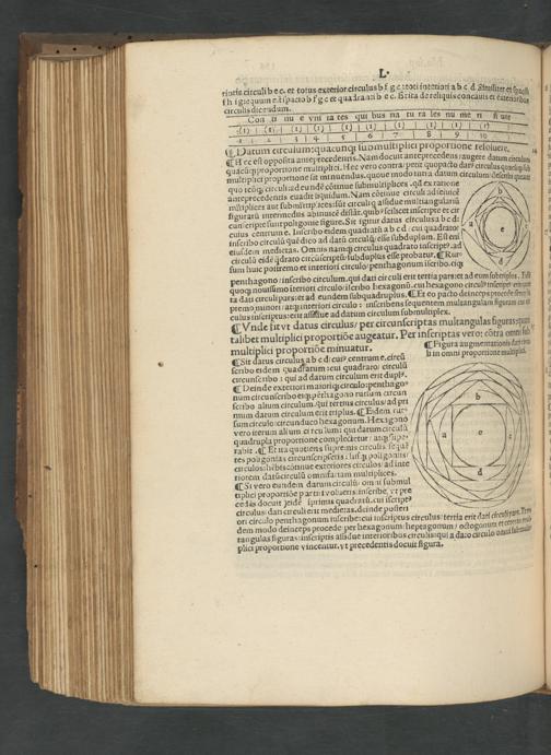 roportione ſit minuendus. quoue modo intra datum citculumd cõtinue ſubmultiphces · qd ex ratione am cõtinue circuli ad ſeiuicẽ młtiplices aut ſubmłttip ices:ſũt circuliꝗ aſſidue multiangularũ figurarũ intermedus abiuicẽ diſtãt. quibꝰ ſcilcet inſcripte et cir cunſcripte ſunt poligonie figure.Sit igitur datus circulusabod: cuius centrume. Iuſcribo eidem quadratũ a bc d /cui quadrato? inſcribo circulũ quẽdico ad datũ cculũ/ eſſe ſubduplum. Eſt enĩ eiuſdein medietas. Omms namq; circulus quadrato inſcriptꝰ.ad circulũ eidẽ qᷓdrato circũſcriptũ/ ſubduplũs eſſe probatur. ¶ Rur⸗ ſum huic poſtremo et interiori circulo⸗ penthagonum iſcribo· eiq penthagono/ inſcribo circulum.qui dati cir culi erit tertia pars:et ad eum ſubtriplus. Půi quoqʒ nouiſũmo iteriori circulo/ĩſcribo hexagonũ. cui hexagono circułꝰ inſcriptꝰ eritqu ta dati circulipars:et ad eundem ſubquadruplus. ¶CEt eo pacto deinceps procede: ſempſi premominori/ àtq; interiori circulo: inſcribens ſequentem multangulam figuram cuci culus inſcriptus: erit aſſiue ad datum circulum ſubmultiplex. Vnde fit vt datus circulus/ per circunſcriptas multangulas figuras: qun talibet multiplici proportiõe augeatur. Per inſcriptas vero: cõtta omni ſib CFigura augmentationis dat cici Iin omni proportione multipld
