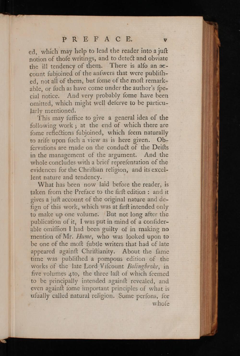What has been now laid before the reader, is taken from the Preface to the firſt edition: and it gives a juſt account of the original nature and de- ſign of this work, which was at firſt intended only to make up one volumnc. But not long after the publication of it, I was put in mind of a conſider- able omiſſfion Ihad been guilty of in making no mention of Mr. Hume, who was looked upon to be one of the moſt ſubtle writers that had of late appeared againſt Chriſtianity. About the ſame time was publi iſhed a pompous edition of the works of the late Lord Viſcount Bolingbroke, in five volumes 4to, the three laſt of which ſe emecdl to be principally intended zoaiaft revealed, and even againſt fome important principles of what is uſua lly called natural hgioi Some perſons, for