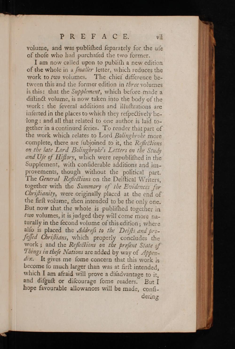 the firſt volume, then intended to be the only one. But now that the whole is publiſhed together in raοο volumes, it is judged they will come more na- turally in the ſecond volume of this edition; where alſo is placed the Addreſs to tbe Deiſzs and pro- feſſed Cbriſtians, which properly concludes the work; and the Reflections on the Breſent State IT bings in tkeſe Nations are added by way of Appen- diw. It gives me ſome concern that this work is become ſo much larger than was at firſt intended, which I am afraid will prove a diſadvantage to it, and diſguſt or diſcourage ſome readers. But I hope favourable allowances will be made, conſi-