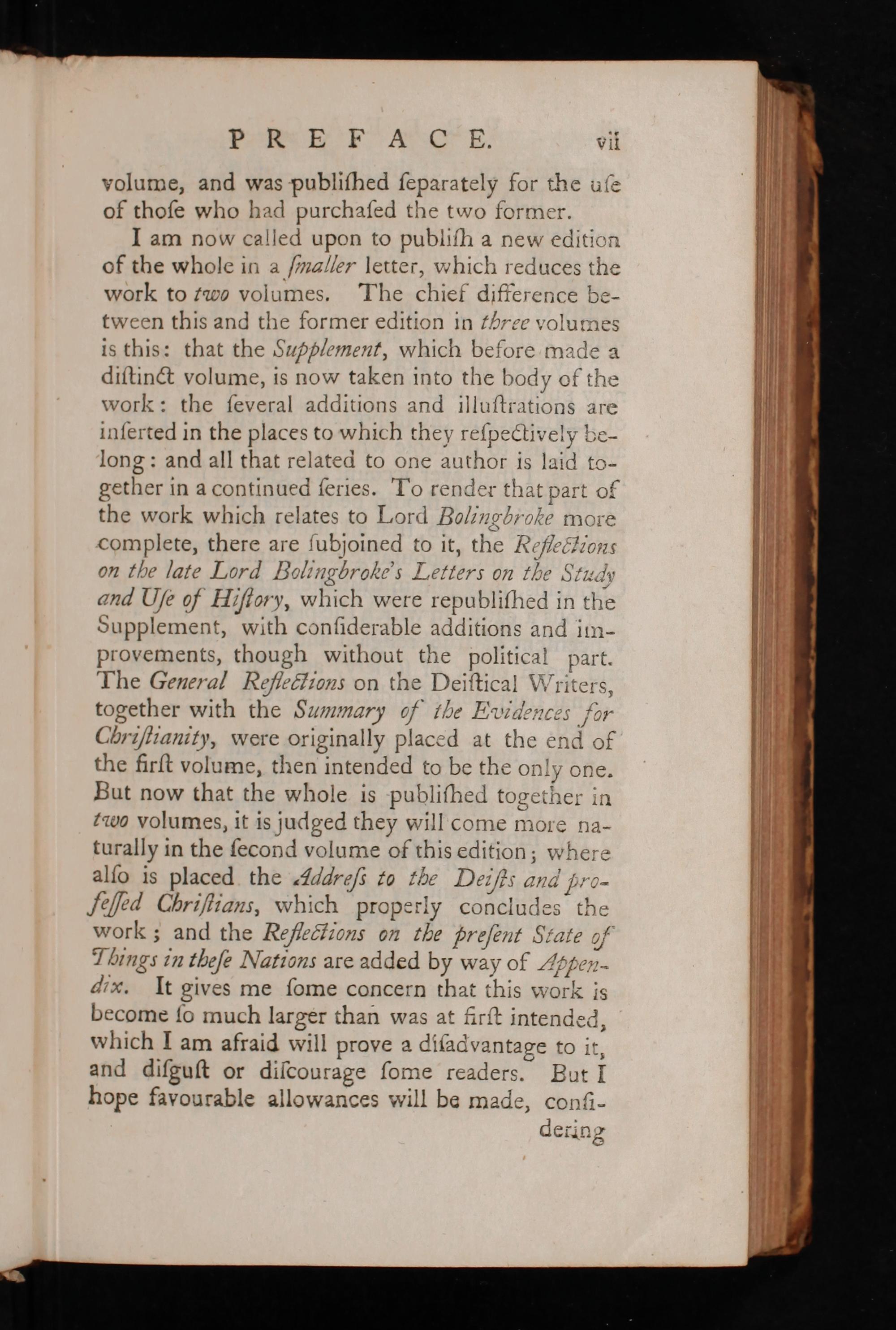 I am now called upon to publiſh a new edition of the whole in a ſmaller letter, which reduces the work to two volumes. The chief difference be- tween this and the former edition in tbree volumes is this: that the Supplement, which before made a diſtinct volume, is now taken into the body of the work: the ſeveral additions and illuſtrations are inſerted in the places to which they reſpectively be- long: and all that related to one author is laid to- gether in a continued ſeries. To render that part of the work which relates to Lord Bolingbroke more complete, there are ſubjoined to it, the Refloczions on the late Lord Bolingbroke’s Letters on the Study and Uſe of Hiſtory, which were republiſhed in the Supplement, with conſiderable additions and im- provements, though without the political part. The General Roefleclions on the Deiſtical Writers,