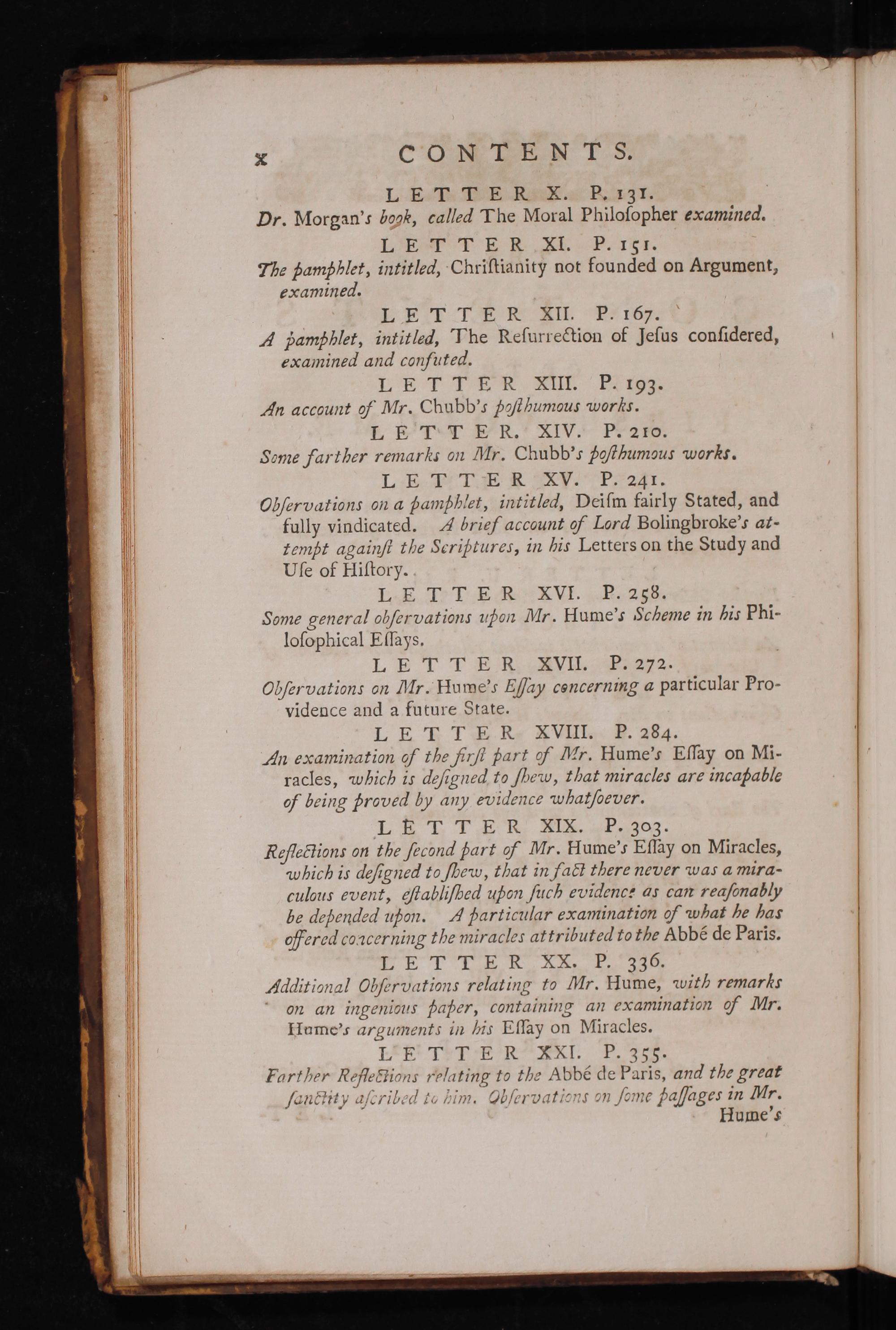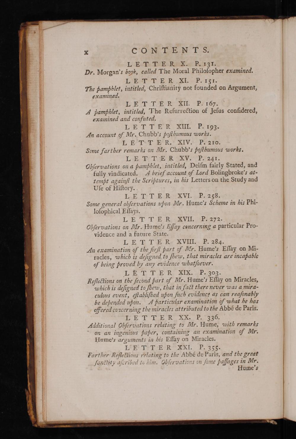 LET TER XI. P. I5I. The pamphlet, intitled, Chriſtianity not founded on Argument, examined. LE TTER XII. P. 167. A pamphlet, intitled, The Reſurrection of Jeſus conſidered, examined and confuted. 1. ETT ER XIII. P. 193. An account o Mr. Chubb's Poſthumous works. E B I T E R. XIV. P. 210. Some farther remarks on Mr. Chubb's Boſthumous works. LE TITER XV. P. 241. Cbſervations on a Pamphlet, intitled, Deiſm fairly Stated, and fully vindicated. A brief account Lord Bolingbroke's at- tempt againſi the Seriptures, in his Letters on the Study and Uſe of Hiſtory. LETT ER XVI. P. 253. Some general obſervations upon Mr. Hume's Scheme in his Phi- loſophical Eſſays. LE TTER XVII. P. 272. Obſer vations on dr. Hume's Eſſay concerning a particular Pro- vidence and a future State. L E T T E R XVIII. P. 284. An examination of the firft part f Wr. Hume's Eſſay on Mi- racles, wbhich is deſigned to ſbew, that miracles are incapable of being proved by any eævidence whatſoever.