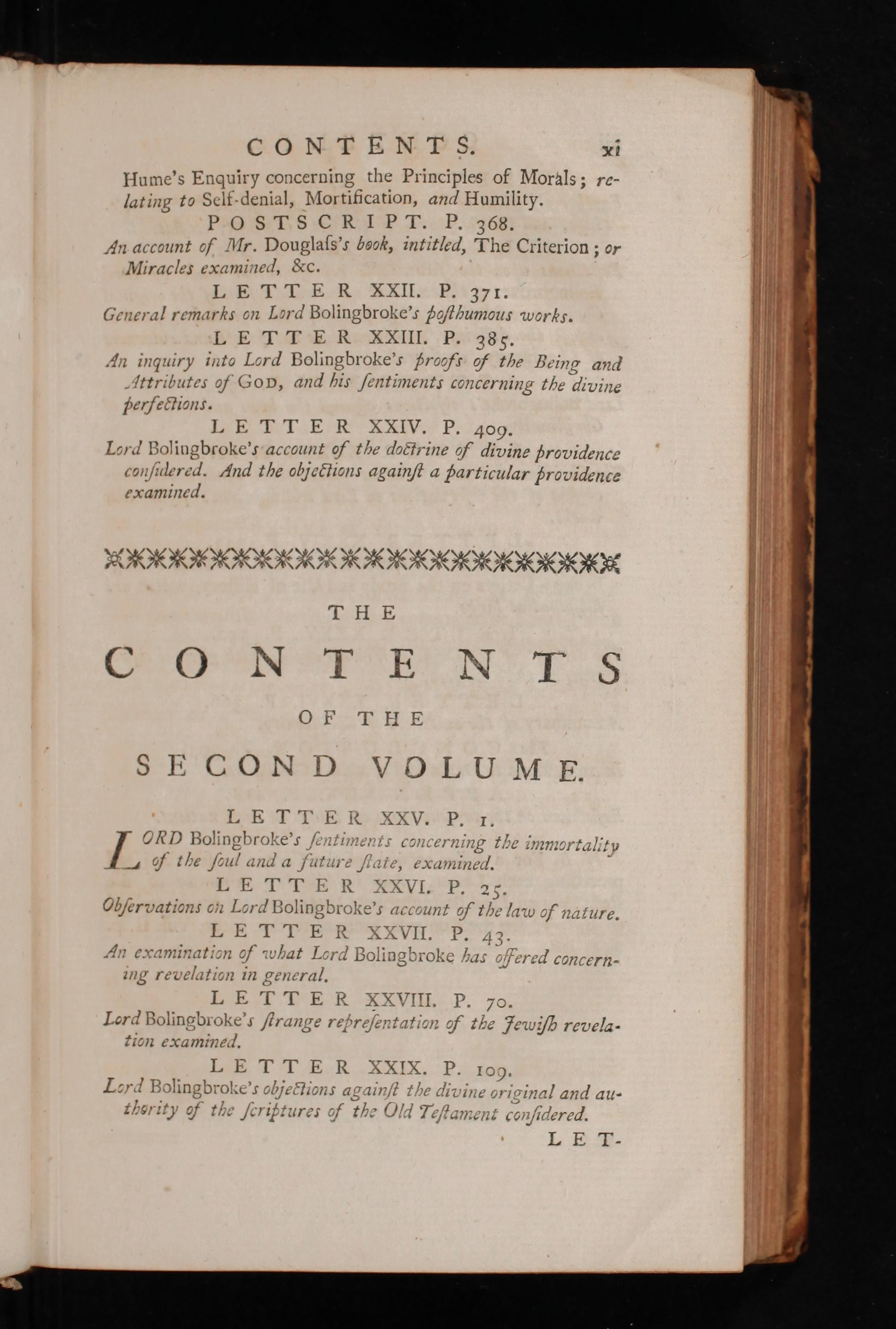 Hume's Enquiry concerning the Principles of Morals; re- lating to Self-denial, Mortification, and Humility. PosTrscRIp T. P. 368. An account of Mr. Douglaſs's beok, intitled, The Criterion; or Miracles examined,&c. LEITTER XXII. P. 371. General remarks on Lord Bolingbroke's oſthumous works. LE T TER XXIII. P. 335. An ingquiry into Lord Bolingbroke's Sroofr of the Being and Attributes f Gop, and his ſentiments concerning the aiwins perfe ctions. L ETT ERXXIV. P. 409. Lord Bolingbroke's account of the doctrine ꝗf divine providence