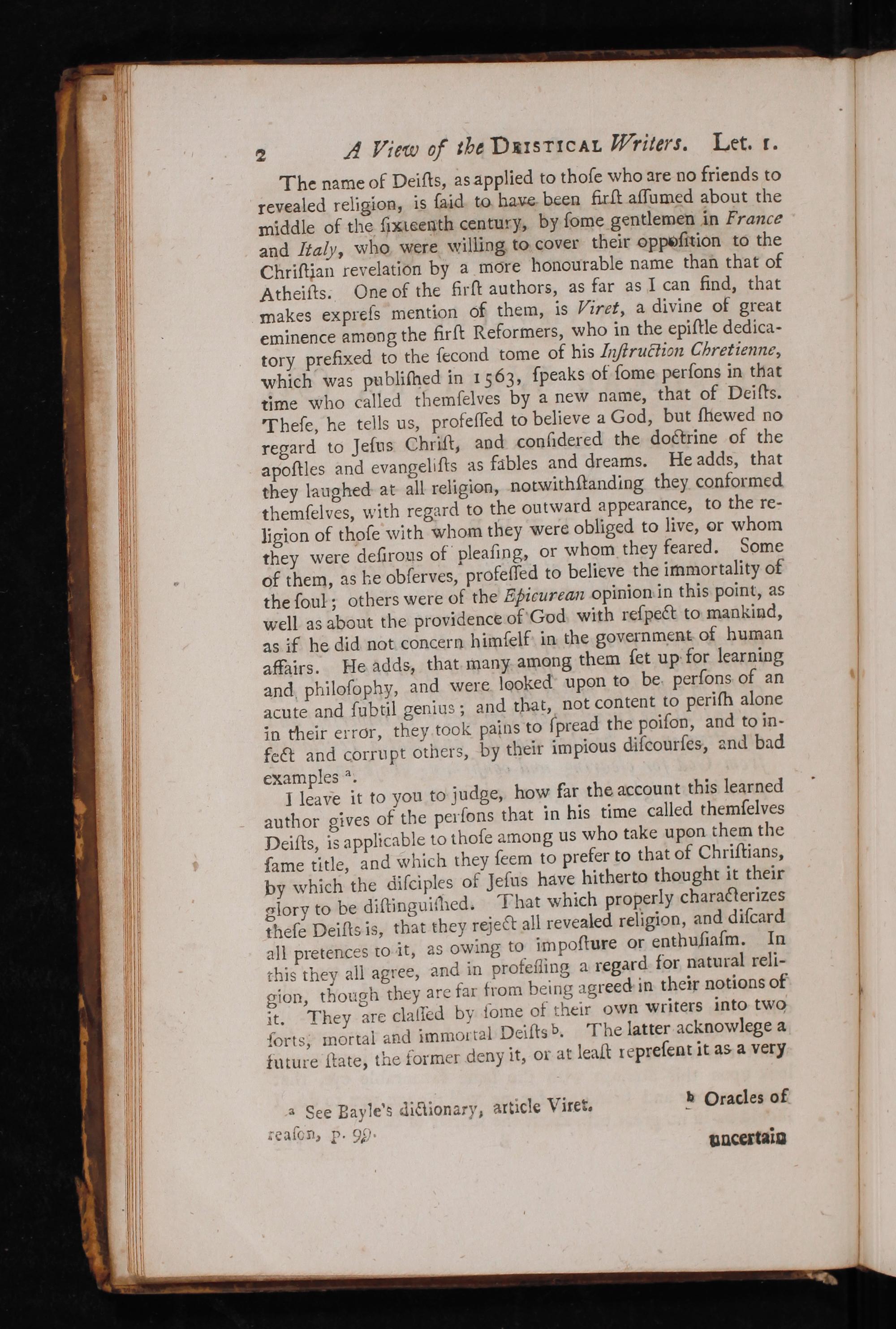The name of Deiſts, as applied to thoſe who are no friends to revealed religion, is ſaid to have been firſt aſſumed about the middle of the fixteenth century, by ſome gentlemen in France and Italy, who were willing to cover their oppoſition to the Chriſtian revelation by a more honourable name than that of Atheiſts. One of the firſt authors, as far as I can find, that makes expreſs mention of them, is Viret, a divine of great eminence among the firſt Reformers, who in the epiſtle dedica- tory prefixed to the ſecond tome of his Inſtruction Chretienne, which was publiſhed in 1563, ſpeaks of ſome perſons in that time who called themſelves by a new name, that of Deilts. Theſe, he tells us, profeſſed to believe a God, but ſſiewed no regard to Jeſus Chriſt, and conſidered the doctrine of the apoſtles and evangeliſts as fables and dreams. He adds, that they laughed at all religion, notwithſtanding they conformed themſelves, with regard to the outward appearance, to the re- ligion of thoſe with whom they were obliged to live, or whom they were deſirous of pleaſing, or whom they feared. Some of them, as he obſerves, profeſſed to believe the immortality of the ſoul; others were of the Epicurean opinion in this point, as well as about the providence of God with reſpect to mankind, as if he did not concern himſelf in the government of human affairs. He adds, that many among them ſet up for learning and philoſophy, and were ſocked upon to be perſons of an acute and ſubtil genius; and that, not content to periſh alone in their error, they took pains to ſpread the poiſon, and to in- fect and corrupt others, by their impious diſcourſes, and bad examples a.