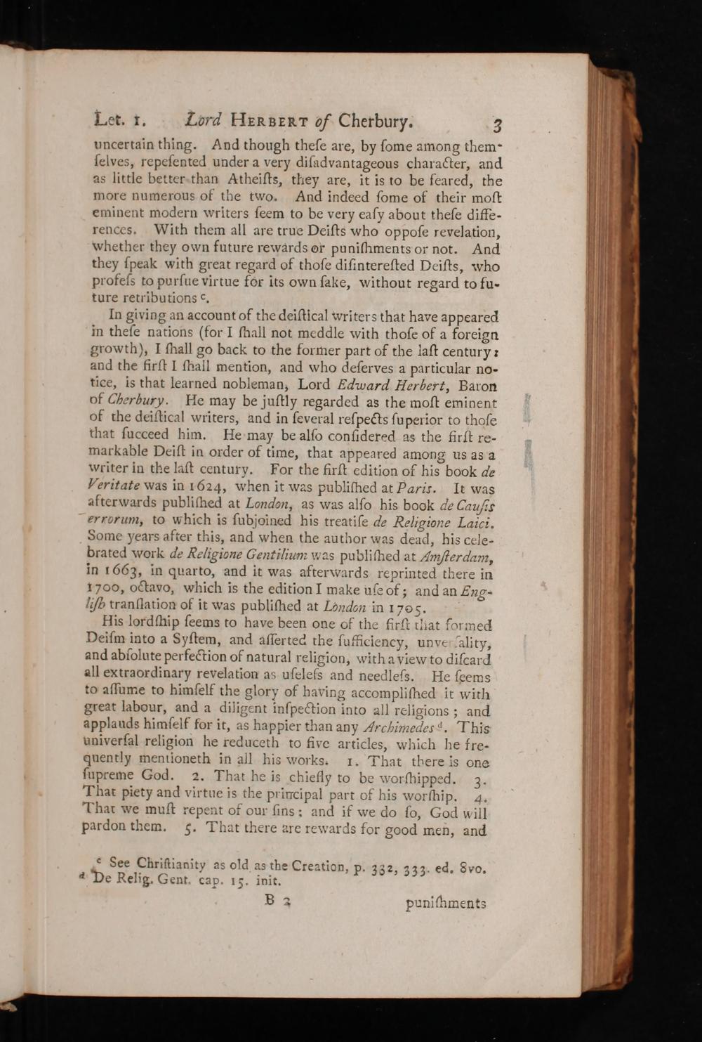 In giving an account of the deiſtical writers that have appeared in theſe nations(for I ſhall not meddle with thoſe of a foreign growth), I fhall go back to the former part of the laſt century: and the firſt I fhall mention, and who deſerves a particular no- tice, is that learned nobleman, Lord Edward Herbert, Baron of Cherbury. He may be juſtly regarded as the moſt eminent of the deiſtical writers, and in ſeveral reſpects ſuperior to thoſe that ſucceed him. He may be alſo conſidered as the firſt re- markable Deiſt in order of time, that appeared among us as a writer in the laſt century. For the firſt edition of his book de Veritate was in 1624, Wwhen it was publiſhed at Barir. It was afterwards publiſhed at London, as was alſo his book de Cauſis errorum, to which is ſubjoined his treatiſe de Religione Laici. Some years after this, and when the author was dead, his cele- brated work de Religione Gentilium was publiſhed at Amſterdam, in 1663, in quarto, and it was afterwards reprinted there in 1700, OCtavo, which is the edition I make uſe of; and an Eng- li% tranſlation of it was publiſhed at London in 1705.
