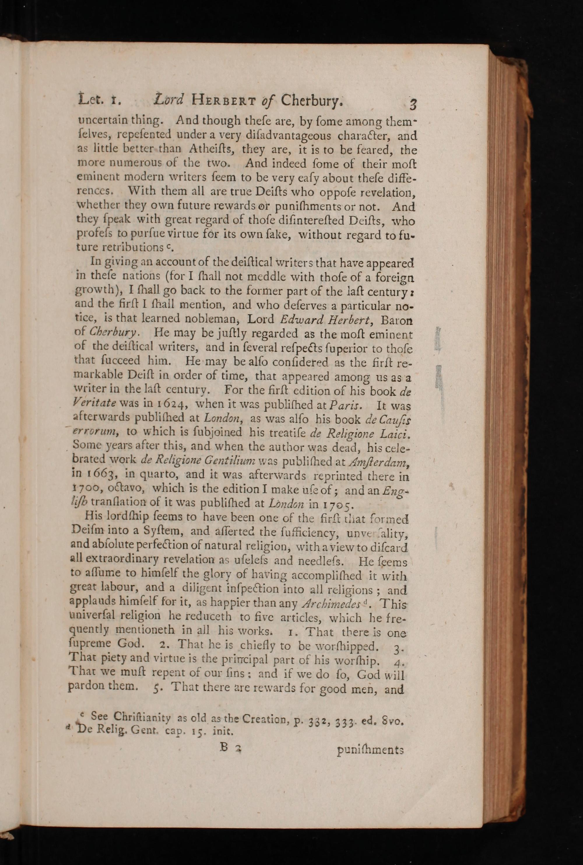 His lordſhip ſeems to have been one of the firſt tliat formed Deifſm into a Syſtem, and aſſerted the ſufficlency, unve ality, and abiolute perfection of natural religion, with a view to diſcard all extraordinary revelation as uſeleſs and needleſs. He ſcems to aſſume to himſelf the glory of having accompliſhed it with great labour, and a diligent inſpection into all religions; and applauds himſelf for it, as happier than any Archimedos d. This univerſal religion he reduceth to five articles, which he fre- quently mentioneth in all his works. 1. That there is one ſupreme God. 2. That he is chiefly to be worſhipped. 3. That piety and virtue is the principal part of his worſhip. 4. That we muſt repent of our ſins: and if we do ſo, God will Pardon them. 5. That there are rewards for good men, and