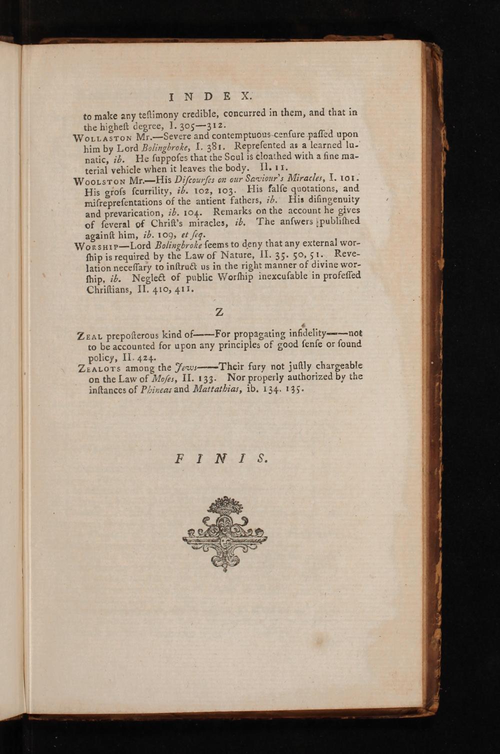 WonsHIP— Lord Bolingbroke ſeems to deny that any external wor- ſhip is required by the Law of Nature, II. 35. 50, 51. Reve- lation neceſſary to inſtruct us in the right manner of divine wor- ſhip, ib. Neglect of public Worlhip inexcuſable in profeſſed Chriſtians, II. 410, 411.