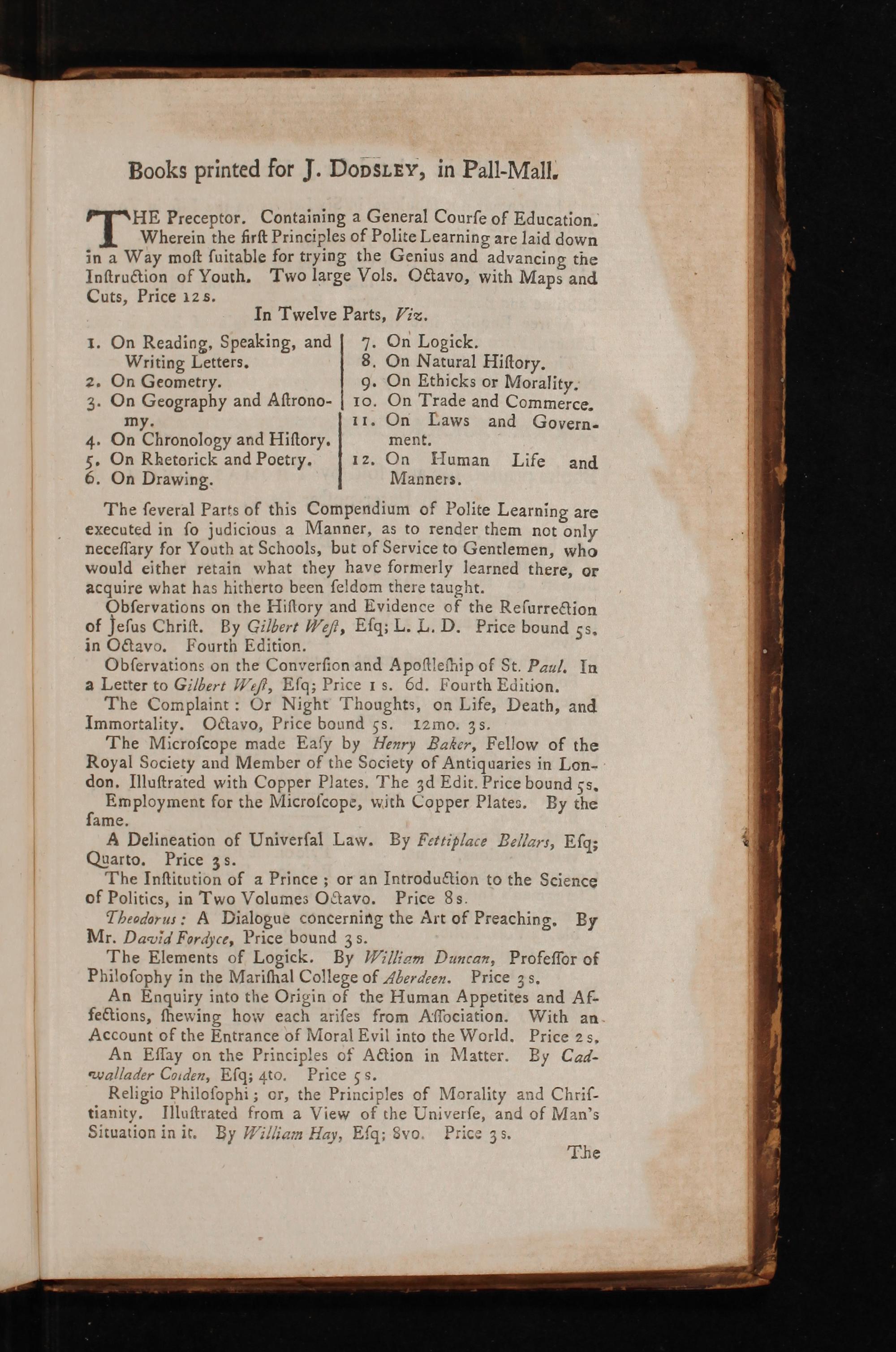 HE Preceptor. Containing a General Courſe of Education. Wherein the firſt Principles of Polite Learning are laid down in a Way moſt ſuitable for trying the Genius and advancing the Inſtruction of VYouth. Two large Vols. Octavo, with Maps and Cuts, Price 12s. In Twelve Parts, Viz.