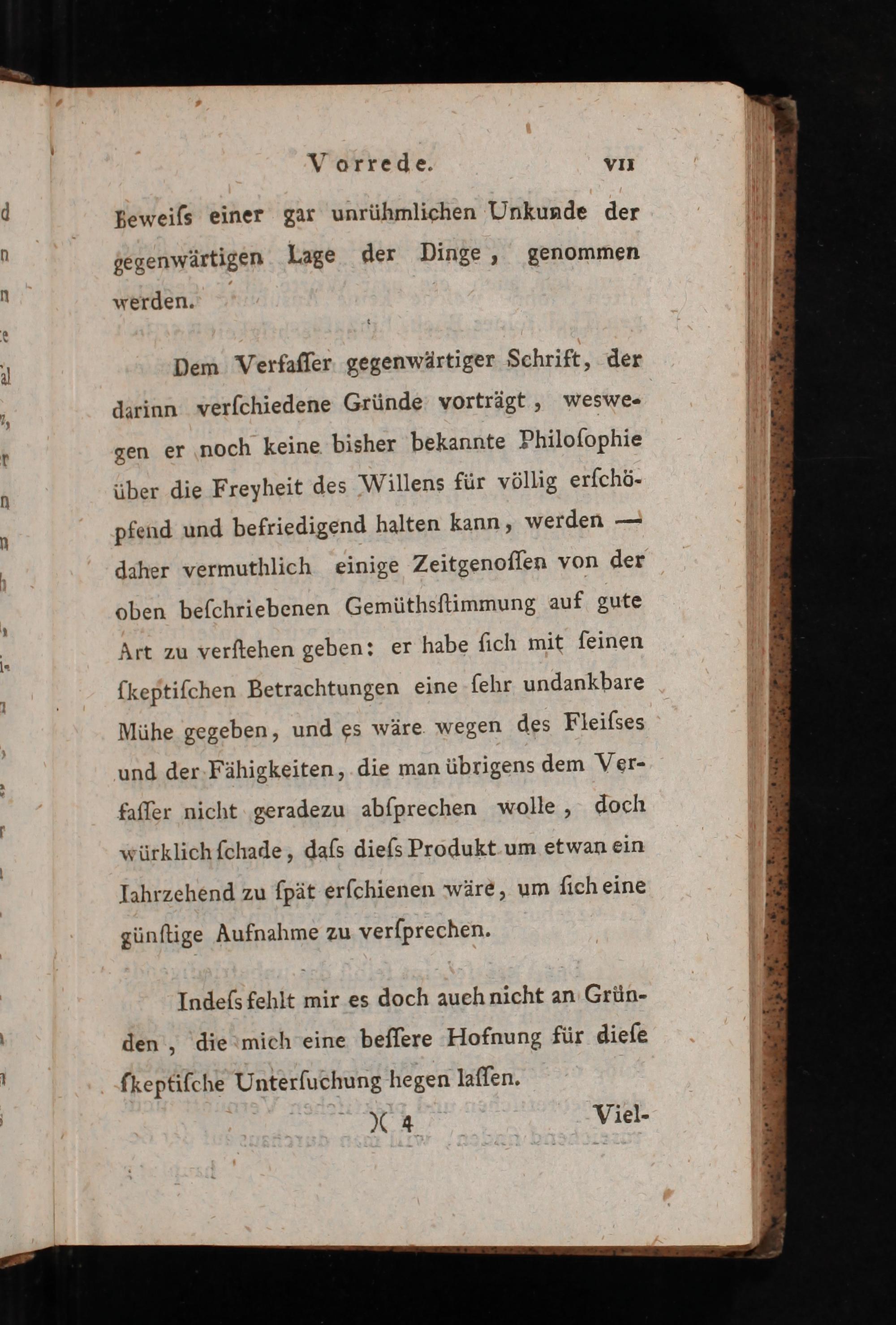 Dem Verfaſſer gegenwärtiger Schrift, der qarinn verſchiedene Gründe vorträgt, weswe⸗ gen er noch keine bisher bekannte Philoſophie über die Freyheit des Willens für völlig erſchö- plend und befriedigend halten kann, werden— gaher vermuthlich einige Zeitgenofſen von der oben beſchriebenen Gemüthsſtimmung auf gute Art zu verſtehen geben: er habe ſich mit ſeinen ſkeptiſchen Betrachtungen eine ſehr undankbare Mühe gegeben, und es wäre wegen des Fleiſses und der Fähigkeiten, die man übrigens dem Ver- kaſſer nicht geradezu abſprechen wolle, doch würklich ſchade, daſs dieſs Produkt um etwan ein Iahrzehend zu ſpät erſchienen wäre, um ſich eine