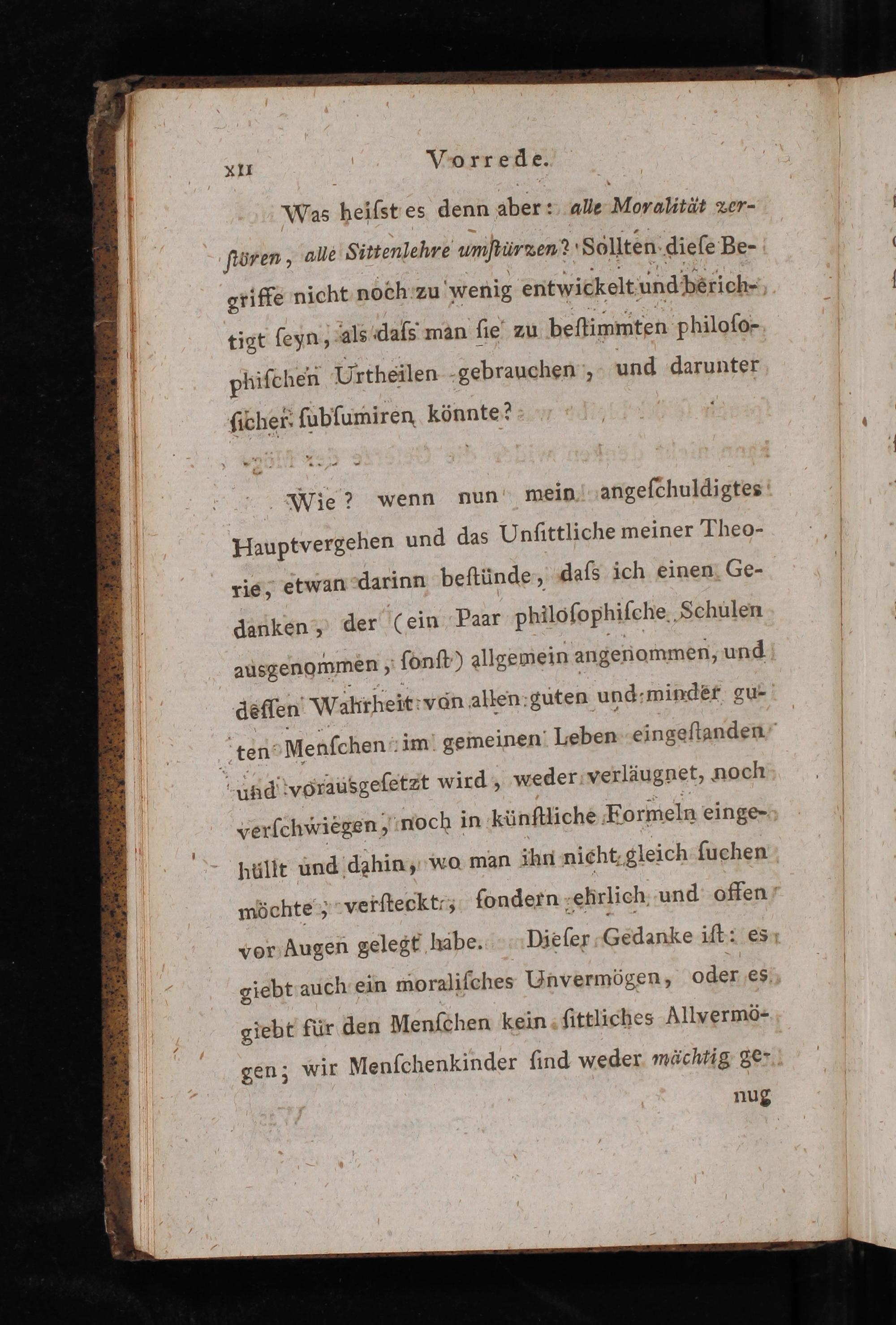 Wie? wenn nun mein angeſchuldigtes Hauptvergehen und das Unſittliche meiner Theo- rie, etwan darinn beſtünde, daſs ich einen Ge- danken, der(ein Paar philoſophiſche Schulen ausgenommen, ſonſt) allgemein angenommen, und deſſen Wahrheit vòn alhen guten und:minder gu- ten Menſchen im gemeinen Leben eingeſtanden und vrausgeſetæt wird, weder verläugnet, noch verſchwiegen, noch in künſtliche Formeln einge- hüllt und dahin, wo man ihn nicht gleich ſuchen möchte; verſteckt:⸗ ſondern ehrlich und offen vor Augen gelegt häbe. Dieſer Gedanke iſt: es giebt auch ein moraliſches Unvermögen, oder es giebt für den Menſchen kein ſittliches Mlvermö-