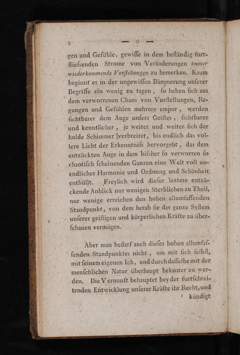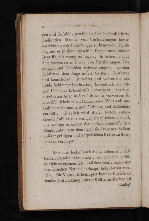 gen und Gefühle, gewiſſe in dem beſtändig fort- flieſsenden Strome von Veränderungen immer wiederkommende Vonſtelumgen zu bemerken. Kaum beginnt es in der ungewiſſen Dämmerung unſerer Begriffe ein wenig zu tagen, ſo heben ſich aus dem verworrenen Chaos von Vorſtellungen, Re- gungen und Gefühlen mehrere empor, werden ſichtbarer dem Auge unſers Geiſtes, ſichtbarer und kenntlicher, je weiter und weiter fich der polde Schimmer hwerbreitet, bis endlich das vol⸗ lere Licht der Erkenntniſs hervorgeht, das dem entzückten Auge in dem biſsher ſo verworren ſo chaotiſch ſcheinenden Ganzen eine Welt voll un- endlicher Harmonie und Ordnung und Schönheit enthüllt. Freylich wird dieſer leztere entzü- ckende Anblick nur wenigen Sterblichen zu Theil, nur wenige erreichen den hohen allumfaſfenden Standpunkt, von dem herab ſie das ganze Syſtem unſerer geiſtigen und körperlichen Kräfte zu über-