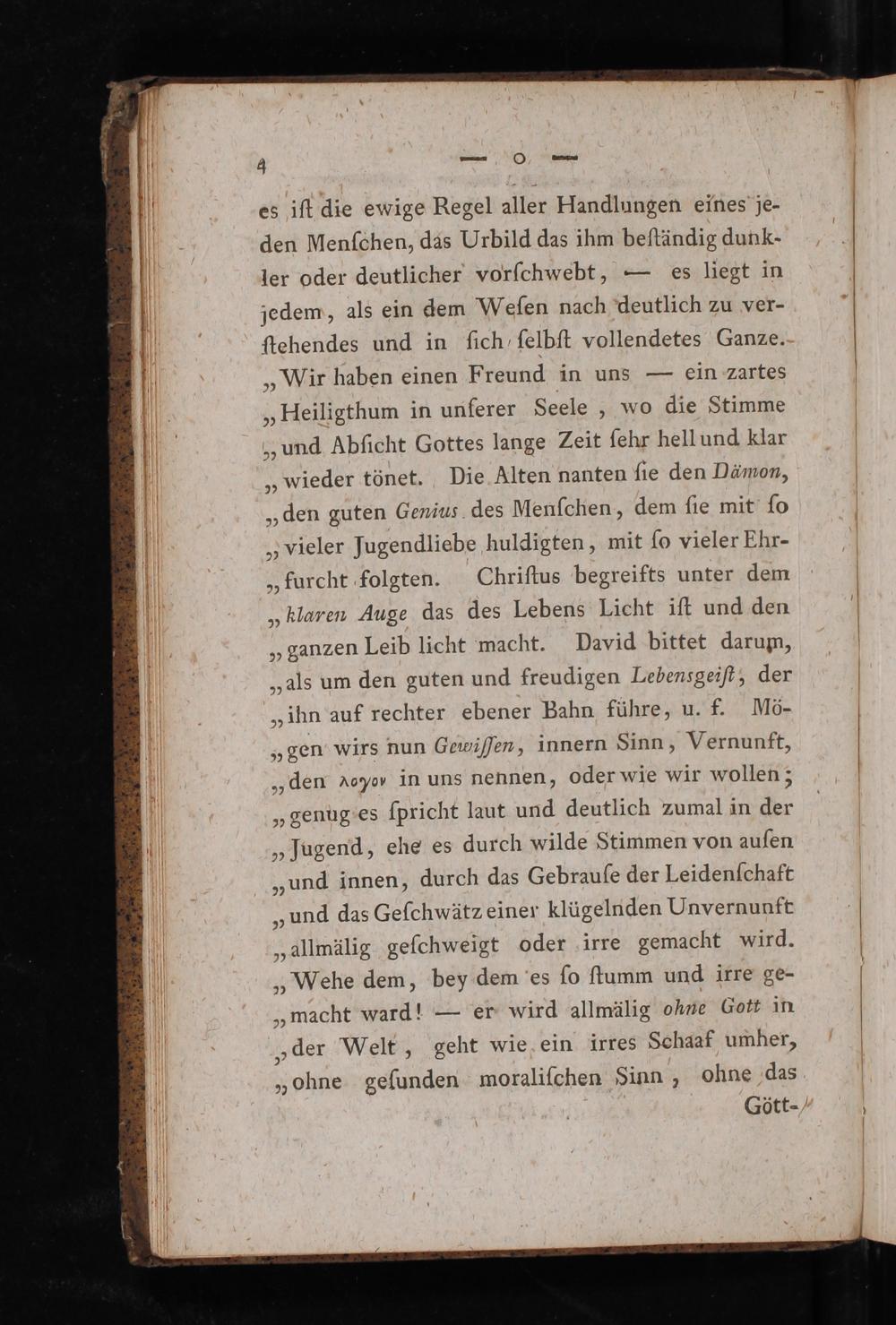 es iſt die ewige Regel aller Handlungen eines je- den Menſchen, das Urbild das ihm beſtändig dunk- ler oder deutlicher vorſchwebt,— es liegt in jedem, als ein dem Weſen nach deutlich zu ver- ſtehendes und in ſich ſelbſt vollendetes Ganze. „Wir haben einen Freund in uns— ein zZartes „Heiligthum in unferer Seele, wo die Stimme „und Abſicht Gottes lange Zeit ſehr hell und klar „wieder tönet. Die Alten nanten ſie den Ddmon, „den guten Genius des Menſchen, dem ſie mit ſo „vieler Jugendliebe huldigten, mit ſo vieler Fhr- „furcht folgten. Chriſtus begreifts unter dem „klaren Auge das des Lebens Licht iſt und den „ganzen Leib licht macht. David bittet darum, „als um den guten und freudigen Lebengeiſt, der „ihn auf rechter ebener Bahn führe, u. f. Mö- „gen wirs nun Gewiſen, innern Sinn, Vernunft, „den Noo in uns nennen, oder wie wir wollen; „genug es ſpricht laut und deutlich zumal in der „Jugend, ehe es durch wilde Stimmen von auſen „und innen, durch das Gebrauſe der Leidenſchaft „und das Geſchwätz einer klügelnden Unwernunft „allmälig geſchweigt oder irre gemacht wird. „Wehe dem, bey dem es ſo ſtumm und irre ge- „macht ward!— er wird allmälig ohne Gott in „der Welt, geht wie ein irres Schaaf umher, „ohne geſunden moraliſchen Sinn, ohne das