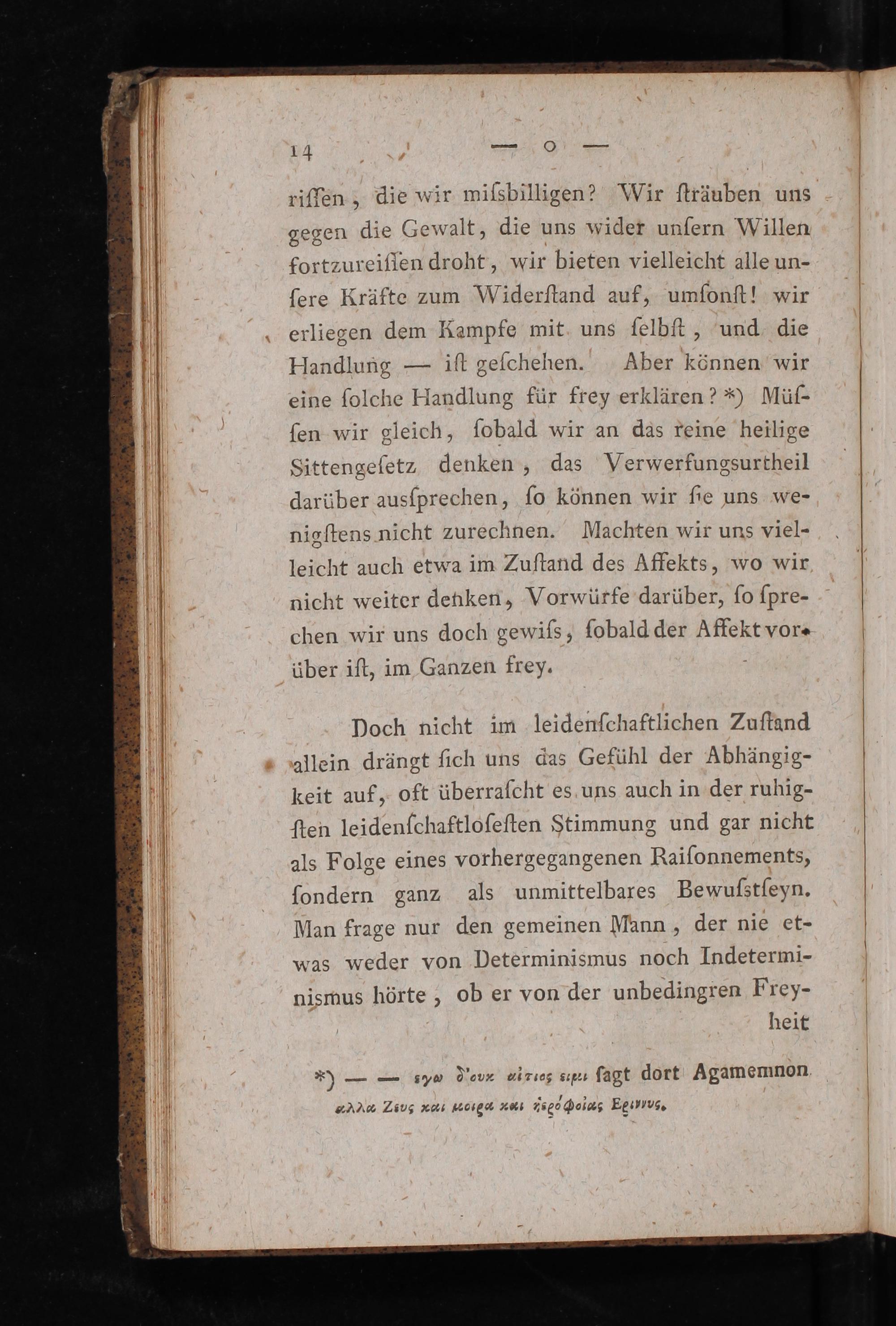 riſſen, die wir miſsbilligen? Wir ſträuben uns gegen die Gewalt, die uns wider unſern Willen fortzureiſſen droht, wir bieten vielleicht alle un- ſere Kräfte zum Widerſtand auf, umſonſt! wir erliegen dem Kampfe mit uns ſelbft, und die Handlung— iſt geſchehen. Aber können wir eine ſolche Handlung für frey erklären?*) Müſf- ſen wir gleich, fobald wir an das reine heilige Sittengeſetz denken, das Verwerfungsurtheil darũber ausſprechen, ſo können wir ſie uns we- nigſtens nicht zurechnen. Machten wir uns viel- leicht auch etwa im Zuſtand des Affekts, wo wir nicht weiter denken, Vorwürfe darüber, ſo ſpre- chen wir uns doch gewifs, fobald der Affekt vor⸗