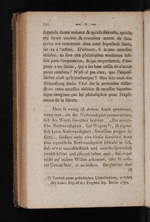 dependu de ma volonte& qu'elle ſpit telle, qu'elle me feroit vouloir& revouloir autant de fois, qu'on me remettroit dans cette hipotheſe fatale, futqe à l'infimi. Dailleurs, ſi la non neceſſiré abſolue, au ſens des philoſophes modernes ſufi- ſoit pour imputation,& qui empecheroit, d'im- puter a un ſoldat, qui a les bras caſſẽs de n avoir point combatu? Neſt-il pas elair, que l'impoſ⸗ ſbilite n'eſt qu?hipothetique? Man ſehe auch die Abhandlung dieſes Verf. fur la pretendue diſtin- St on entre neceſſite abſolue& neceſſite hipothe- tique imaginee par les philoſaphes pour Fenpli- cation de la liherte.