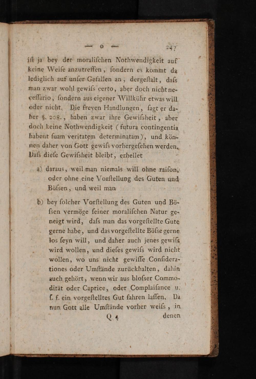iſt ja bey der moraliſchen Nothwendigkeit auf keine Weiſe anzutreffen, ſondern es kommt da lediglich aut unſer Gefallen an, dergeſtalt, daſs man zwar wohl gewiſs certo, aber doch nicht ne- ceſlario, ſondern aus eigener Willkühr etwas will oder nicht. Die freyen Handlungen, ſagt er da- her§. 208., haben zwar ihre Gewiſsheit, aber doch keine Nothwendigkeit(futura contingentia habent ſuam veritatem determinatam), und kön- nen daher von Gott gewiſs vorhergeſehen werden. Daſs dieſe Gewiſsheit bleibt, erhellet