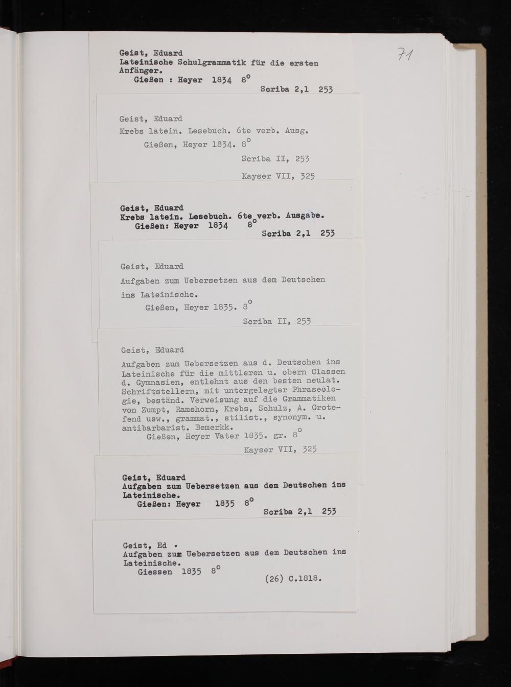 Geist, Eduard Aufgaben zum Uebersetzen aus dem Deutschen ins Lateinische. Gießen: Heyer 1835 80 Scriba 2,1 255