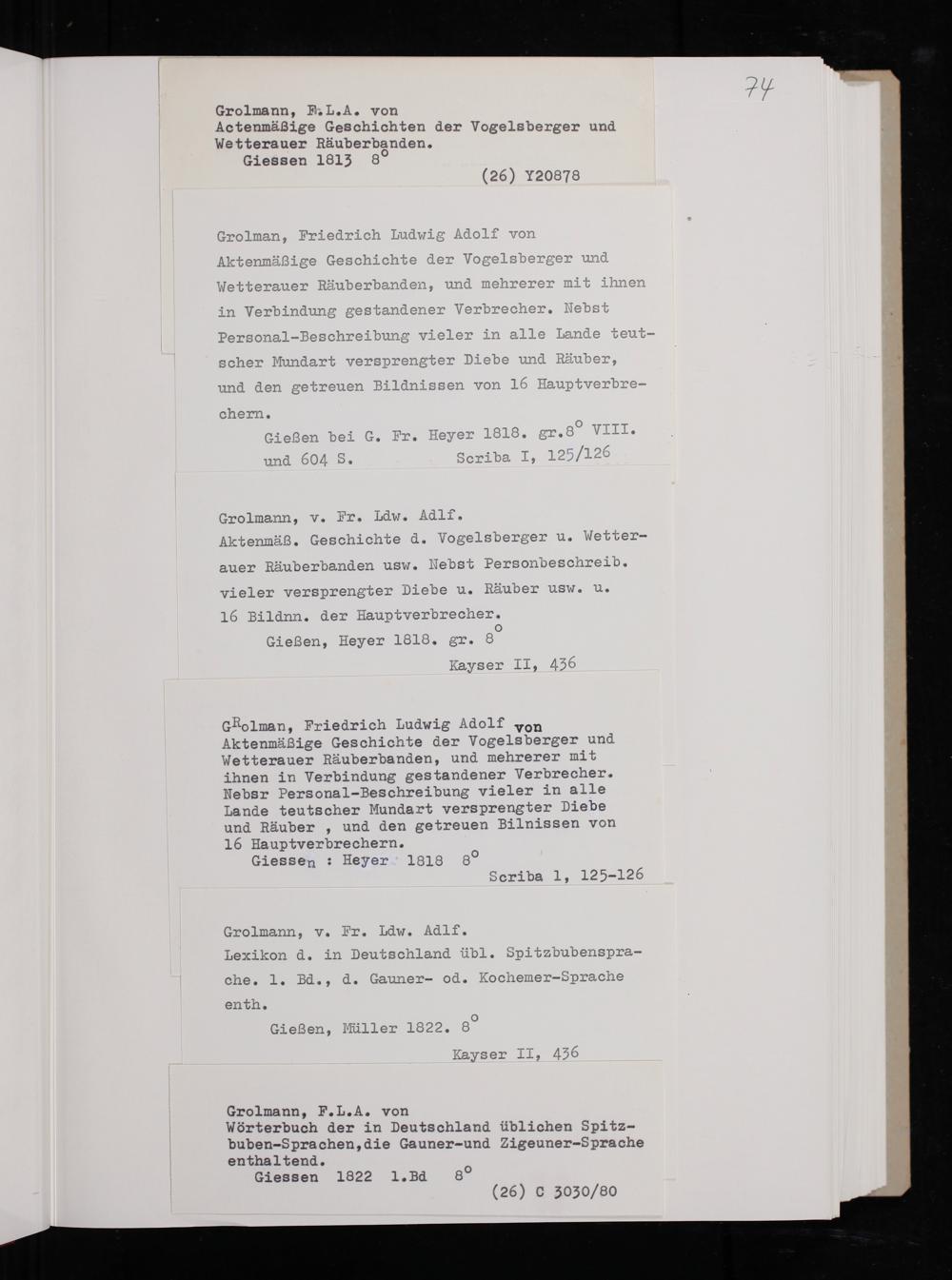 Grolmann, F. L. A. von Wörterbuch der in Deutschland üblichen Spi tz- buben-Sprachen, die Gauner-und Zigeuner-Sprache enthal tend. Giessen 1822 1. Bd 80 (26) G 3030/80