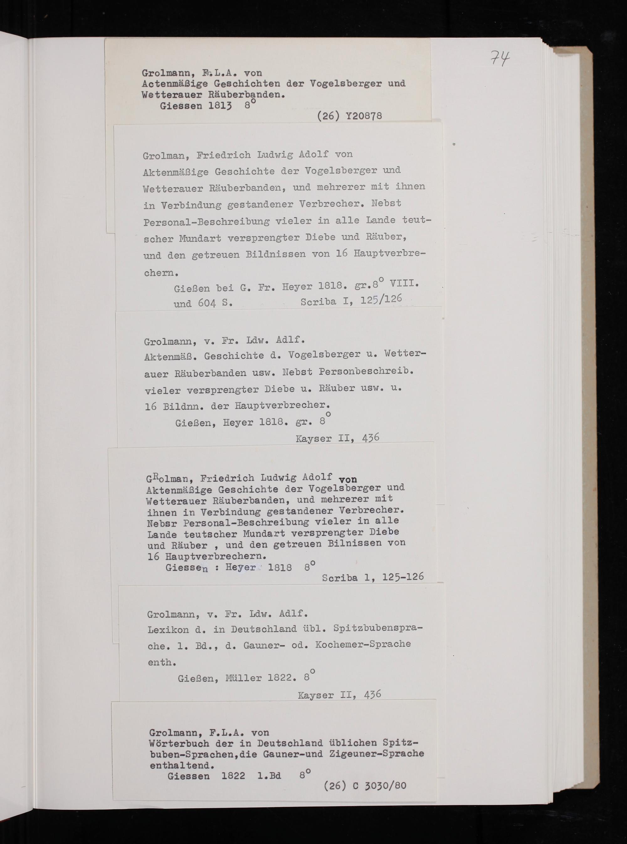 GRolman, Friedrich Ludwig Adolf von Aktenmäßige Geschichte der Vogelsberger und Wetterauer Räuberbanden, und mehrerer mit ihnen in Verbindung gestandener Verbrecher. Nebsr Personal-Beschreibung vieler in alle Lande teutscher Mundart versprengter Diebe und Räuber, und den getreuen Bilnissen von 16 Hauptverbrechern. Giessen: Heyer 1818 8⁰