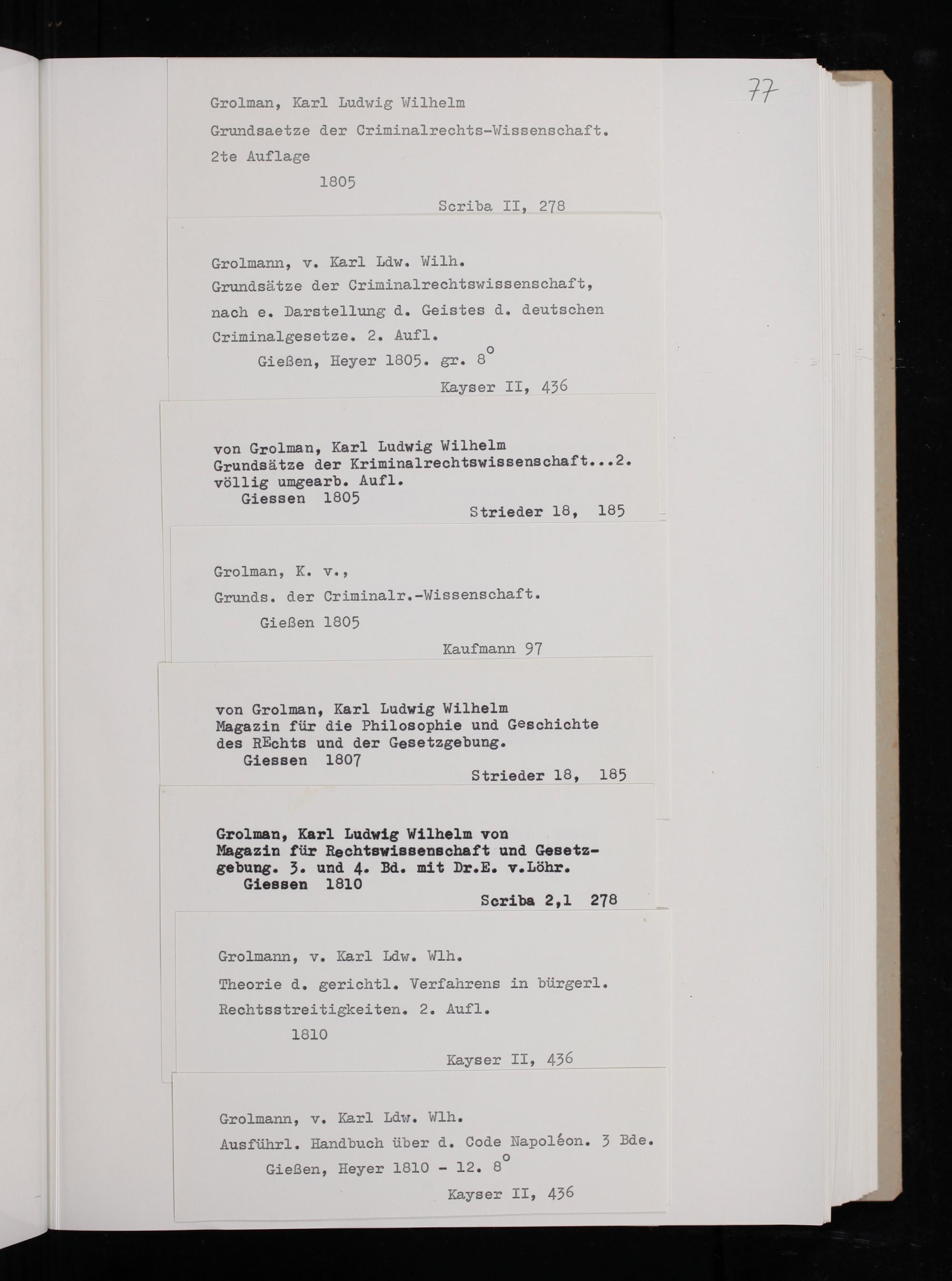 Grolmann, vV. Karl Ldw. VWäTh. Grundsätze der Criminalrechtswissenschaft, nach e. Darstellung d. Geistes d. deutschen Criminalgesetze. 2. Auf.. Gießen, Heyer 1605. gr. 8 Kayser II, 436