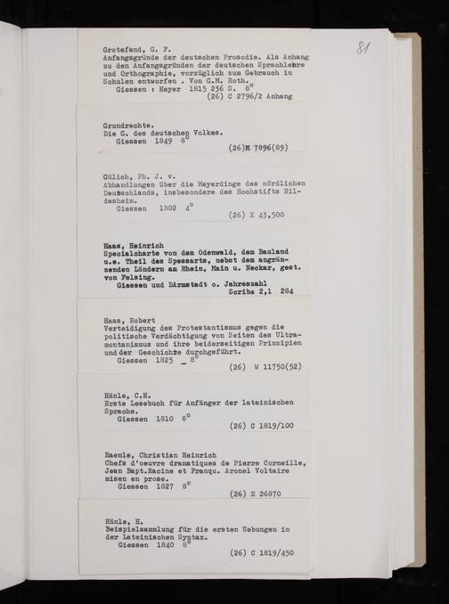 Grotefend, G. F. Sſ. Anfangsgründe der deutschen Prosodie. A1s Anhang zu den Anfangsgründen der deutschen Sprachlehre und Orthographie, vorzüglich zum Gebrauch in Schulen entworfen Von G. M. Roth. Giessen: Heyer 1815 236 8. 8⁰ (26) 2796/2 Anhang