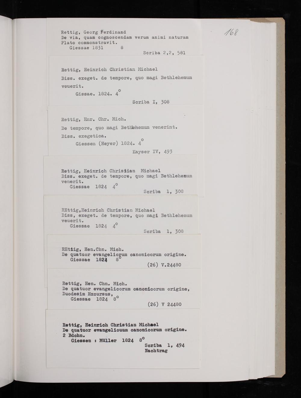 Rettig, Heinrich Christian Micheel De quatuor evangeliouum canonicorum origine. 2 Bdchn. Giessen: Müller 1824 80 Scriba 1, 494 Nachtrag