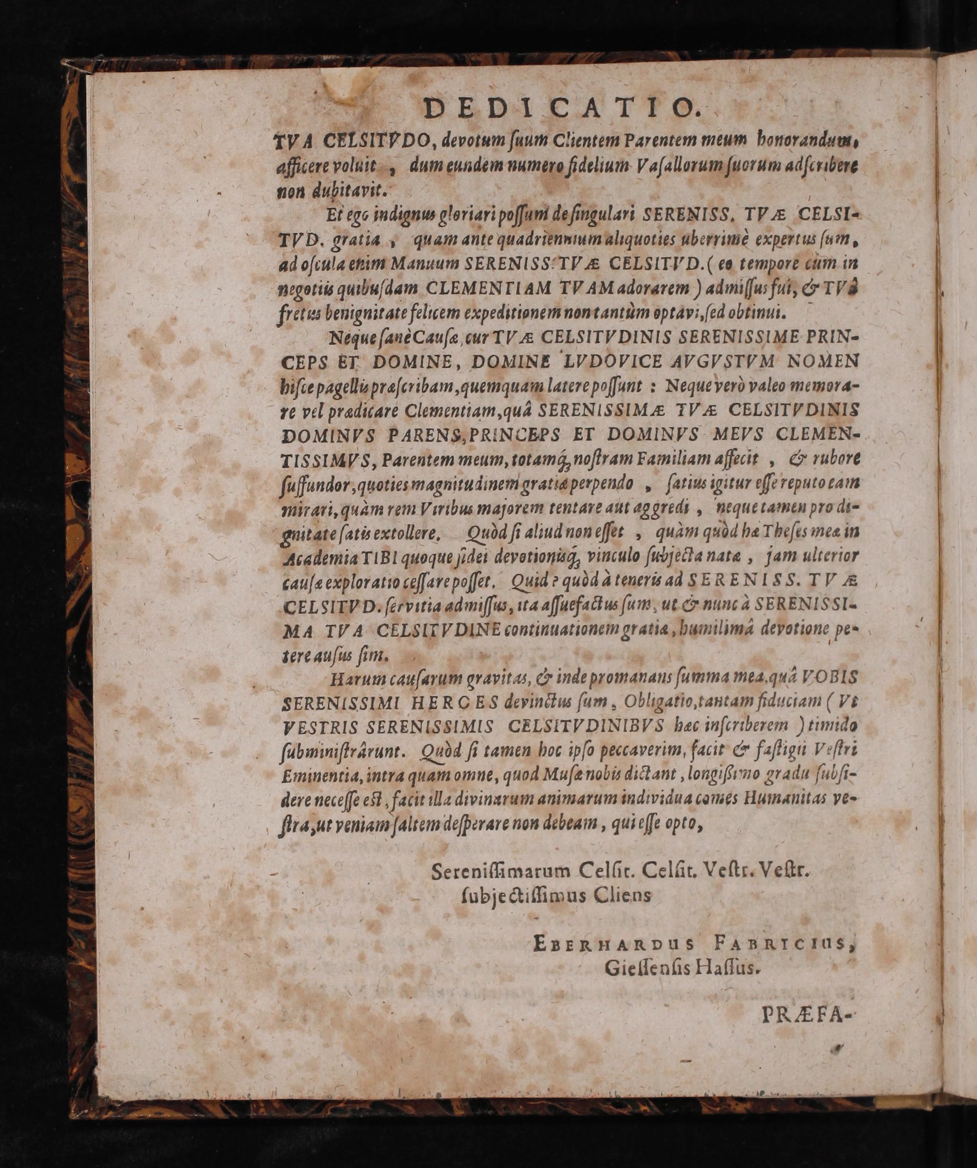 TV4A CkISITPDO, devotum ſuum Clientem Parentem meum honorandum, afſicere voluit, dum eundem numero fidelium Vaſallorum ſuotum adſcribere non duhitavit.
