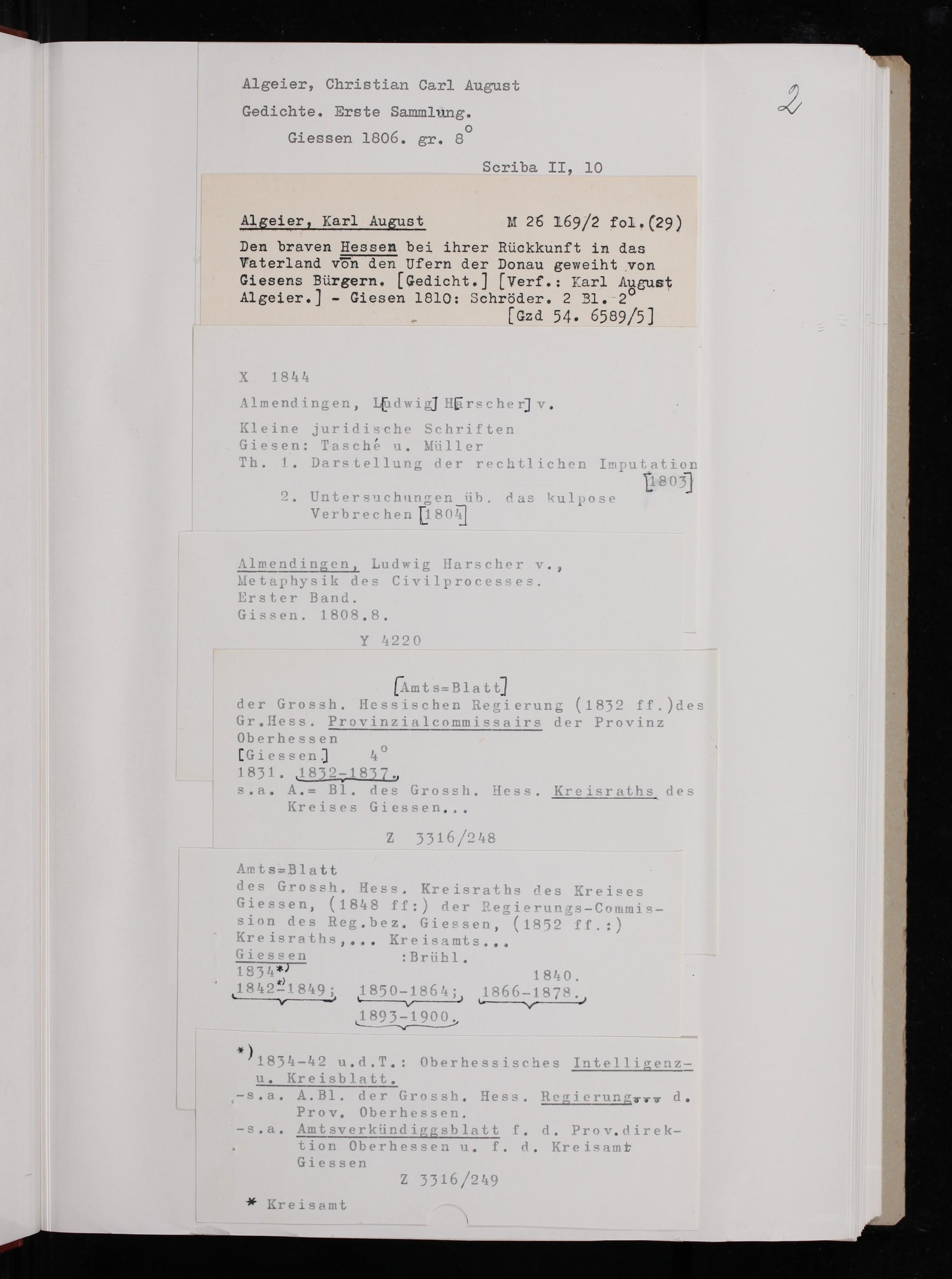 Den braven Hessen bei ihrer Rückkunft in das Vaterl and vön den Ufern der Donau geweiht von Giesens Bürgern.[Gedicht.][Verf.: Karl Mugust Algeier.]- Giesen 1810: Schröder. 2 B1. 20 [Gz⁊d 54. 6589/5]