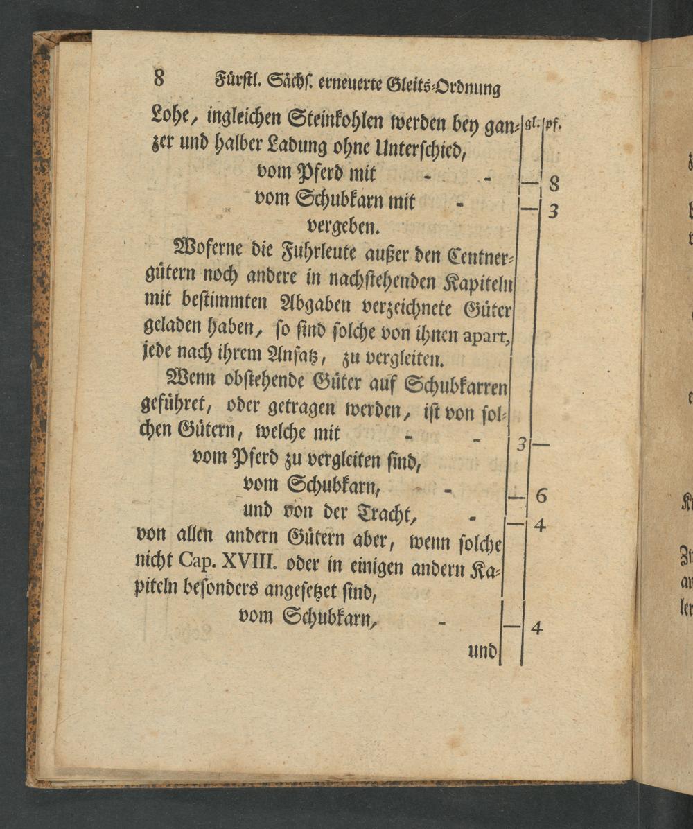Lohe, ingleichen Steinkohlen werden bey gan⸗ zer und halber Ladung ohne Unterſchied, vom Pferd mit voom Schubkarn mit gergeben. 2 Woferne die Fuhrleute außer den Centner⸗ guͤtern noch andere in nachſtehenden Kapiteln mit beſtimmten Abgaben verzeichnete Guͤter geladen haben, ſo ſind ſolche von ihnen apart, jede nach ihrem Anſatz, zu vergleiten.