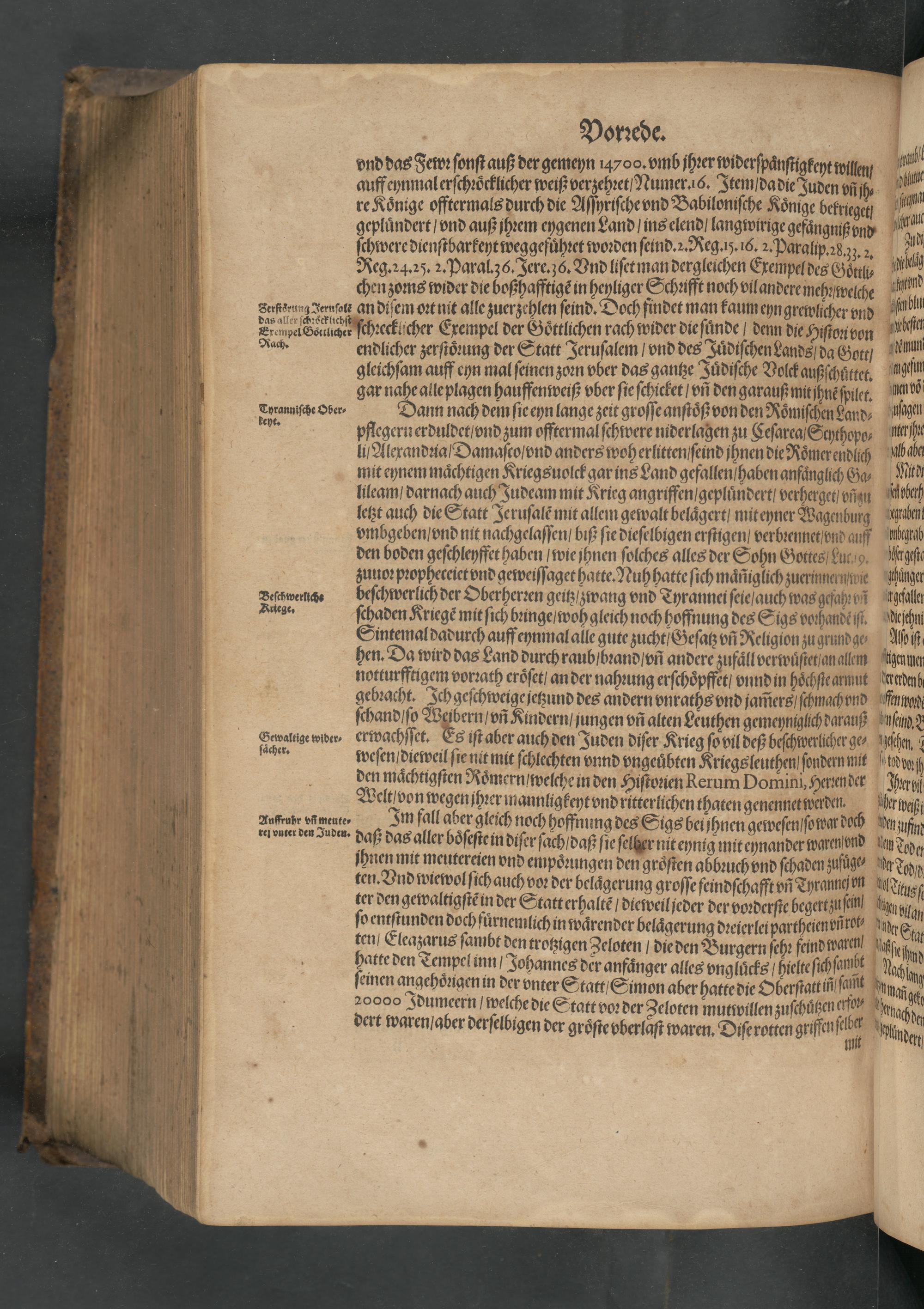 gleichſam auff eyn mal ſeinen zoen vber das gantze Juͤdiſche Volck außſchůttet. gar alleplagen hauffenweiß vber ſie ſchicket/ vñ den garauß mitjhnẽ ſpilet. Dann nach dem ſie eyn lange zeit groſſe anſtoß von den Roͤmiſchen Land⸗ pflegern erduldet vndzum offtermal ſchwere niderlagen zu Geſarea/ Scythopo⸗ li Alerandꝛia/ Damaſoo/ vnd anders woherlitten ſeind jhnen die Roͤmerendlich mit eynem maͤchtigen Kriegsuolck gar ins Land gefallen /haben anfůͤnglich Ga⸗ lileam/ darnach auch Judeam mit Krieg angriffen/ gepluͤndert/ verherget vñzu letzt auch die Statt Jeruſalẽ mit allem gewalt belaͤgert/ miteyner Wagenbung vmbgeben/ vnd nit nachgelaſſen/ biß ſie dieſelbigen erſtigen/ verbꝛennet vnd auf den boden geſchleyffet haben/ wie jhnen ſolches alles der Sohn Gottes Luc 9. zuuoꝛpꝛopheceiet vnd geweiſſaget hatte. Nuhhatte ſich maͤñiglich ʒuerinnernwe Zeſzweruc beſchwerlich der Oberherꝛen geitz zwang vnd Tyrannei ſeieſauch was gefahꝛ vñ Zege⸗ ſchaden Kriegẽ mitſich bunge/ woh gleich noch hoffnung des Sigs vothandẽ ſſ. Sintemal dadurch auffeynmal alle gute ʒucht Geſatz vñ Religion zu grundge⸗ hen. Da wird das Land durch raub/ bꝛand/ vñ andere zufaͤll verwůͤſtet an allem