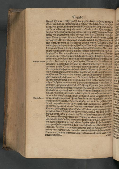 ſchutz vñ ſchirm wie er bißher gutẽ Friden gehabt/ vñ vnſere nahrung mit vnſern Weibern vñ Kindern ruͤhilich genoſſen haben. So gehet vns auchdurch Got⸗ tes gnad an guten Oꝛdnungen Gericht vñ Recht geſundẽ Lufft Fruchtbarkeyt des Lands nichts ab/ ſonder ſeind mit allẽ denẽ ſtucken wol verſehen die zubeſel⸗ lung der Kirchẽ Rathauß vñ haußhaltũg notiwẽdig ſeind. Vñ magmit Wahr⸗ heyt võ vns geſagt werden/ wie Eſa.j võ den Judẽ ſagt: Mein lieber Sohn hat eynen Weinberg an eynẽ fetten vꝛt/ vñ er hat jhn verzaͤunet/ vñ mit eyner Maurẽ verwahret/ vñedle Reben darein geſencket/ er bawet auch eynẽ Thurn darein/ vñ grub eyne Kelter darein/ vñ wartet biß er Trauben braͤchte. Daher ſolte nuh bei vns aucheyn ſchuldiger gehoꝛſam/ Chriſtliches Leben/ wahte danckbarkeytvñ al⸗ lerley gute Fruͤchten vnſers Chrꝛiſtenthum̃s võ rechts wegen volgẽ· Aber da will es noch allenthalben fehlen/ vnd miergend recht von ſtatten gehẽ. Eben der Wein⸗ berg/ den Gott ſelber mit groſſer muͤhe vnd arbeyt gepflantzet/ vñ mit dẽ Blutſei⸗ nes eyngebomẽ Sohns JeſuChriſti beduͤnget vñ auff dz fleiſſigſt vmbgꝛabẽ hat⸗ der meynung er ſolte gute Trauben/ vñ eynen wolgeſchmacktẽ Wein bungẽ tra⸗ get aller erſt wilde vñ vnzeytige Hewꝛling oder Wintertrollen. Das iſt leyder all⸗ zu wahr/ vñ ſo augenſcheinlich/ daß es nit vil beweiſens darff wer es nitſehẽ wil der mag es greiffen. Dañ da befinden ſich noch wider die erſte Tafel der H Zehen Gebott /groſſe ſicherheyt/ innerliche vñ euſſerliche Abgoͤtterej Fluchen/ Schwe⸗ ren/ Gotteslaͤſterung/ Verachtung des Wons Gottes/ vñ ſeiner H. Satramen⸗