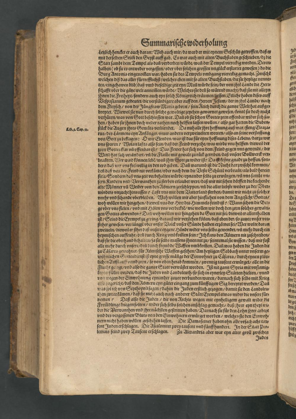 dern daß wir vns freiwillig in den tod geben. Dañ warumb iſt die Nacht darzwiſchẽ kommen/ deñ daß vns der Feind nit voꝛtaͤme/ oder nach dem die Veſte Schuͤttẽ verbraũt/ als bald herein fiele/ Sondern daß vns ʒeit voꝛbehalten wuͤrde/ eynander ſelbs zu erwuͤrgen/ vñ vns ſambt vn⸗ ſern Kindern vnd Verwanthen zu ſterben erlaubet were/ daß wir nit ſehen doͤrffen die keichende alte Maͤnner vñ Weiber von den Romern zerſchleppen/ vñ die aller liebſte weiber zu des Vber⸗ winders vnzucht hinreiſſen? Laßt vns mit dem Vatterland ſterben/ damit wir nicht zu ſolcher vnehr vnd ſchande vberbleiben. Woh woͤllen wir aber hinfliehen von dem Angeſicht Gottes/ woh woͤllen wir hingehen/ dieweil vns der Herꝛ des Himmels feind iſt? Wann ſchon die Ber⸗ ge vber vns fielen/ vnd mit Holen vns verdecktẽ/ wie wollen wir doch den zoꝛn ſolches gewalti⸗ gen Gottes abwenden? Dañ woh woͤllen wir hingehen da Gott nit ſei/ dieweil er allenthalben iſt; Seind die Eyempel zu gering/ darauß wir verſtehen köñen/ daß eben der/ ſo zuuoꝛ vnſer voꝛ⸗ ſteher geweſen/ voꝛ laͤngſi vber vnſer Volck vnſer Suͤnde halben erzoꝛnet ſei⸗ Wer wolte daran zweiueln/ dieweil er ſihet daß vnſere eygene Haͤnde wider vns ſelbs gewendet/ vñ mehꝛ durch ein heymiſchen auffruhr/ deñ durch Krieg vmbkom̃en ſein? Ich kans den Roͤmern nit zuſchreiben ⸗ daß ſie die oberhand behalten/ ja ſie ſelbs maſſens jhnen nit zu/ ſeintemal ſie wiſſen/ daß wir faſt alle mehr durch vnſere/ deñ durch frembde Waffen vmbkom̃en. Dañ was haben die Inden die zu Caͤſarea gewohnet/fuͤr Roͤmiſche Waffen geſehen: Am heyligen Sabbath vnter vnſerm ge⸗ woͤhnlichen Gottesdienſt iſi eyne groſſe maͤñge der Einwohner zu Caͤſarea/ durch eynen ploͤtz⸗ lichen Auffiauff vnnd zoꝛn/ ſo von oben herab kommen/ zwentzig tauſent erwuͤrget/ alle in die Flucht geiagt/ vnd alſo die gantze Statt verwuͤſtet woꝛden. Iſi nit gantz Syria mit vnſinnig⸗