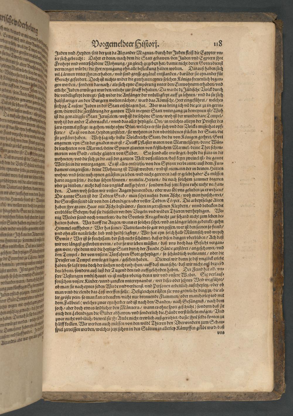 Juden vnd Heyden/ ſeit der ʒeit da Alexander Magnus /durch der Juden fleiß die Egypter vn⸗ ter ſich gebracht: Daher er denn/ nach dem die Statt gebawen/ den Juden vnd Egptern jhre Freiheyt vnd vnterſchidene Wohnung/ zu gleich gegeben hat/ damit nicht deren Gottesdienſt vermenget wuͤrde/ die jhre reynigung ohn alle befleckung halten wolten. Darauß haben ſich vil Laͤrmen vnter jhnen erhaben/ vnd ſind groſſe geʒaͤnck eniſtanden/ daruͤber ſie eynander fur Gericht gefoꝛdert. Doch iſt nichts wider die gutthaten eynes ſolchen Koͤnigs freuenlich began⸗ gen woꝛden/ ſondern darnach/ als ſich eyne Empoͤrung vnter den Einwohnern erhaben/ vnd etliche Juden erwuͤrget wurden/ etliche ʒur ſtraff behalten/ Da warde dz Juͤdiſche Volck durch die vnbilligkeyt bewegt/ ſich wider die Anfaͤnger der vnbilligkeyt auff zu lehnen/ vnd da ſie ſich halßſtarꝛiger an den Burgern wolten raͤchen/ ward das Roͤmiſche Heer eingefuͤhret/ welches ſechʒig Tauſent Juden in der Statt erſchlagen hat. Aber was bring ich vil die zeit zu in gerin⸗ gem/ dieweil die Zerſtoͤrung der gantzen Welt in eyner Statt vntergang ʒu beweynen iſt Woh ſſt die gewaltigſte Statt Jeruſalem/ woh iſt die ſchoͤne Sion/ woh iſt der wunderbare Tempel/ woh iſt der ander Tabernackel/ vnnd das aller heyligſte Ort/ in welches alleyn der Prieſter des jars eynmal pflegt zu gehen/ nicht ohne Blut/ welches er fur ſich vnd des Volcks miſſethat opf⸗ ferte? Es iſt von den Heyden zerſtoꝛet/ ſie wohnen in den vberblibenen ſtuͤcken der Statt/die ſie zerſtoꝛet haben. Woh ſag ich/ biſtu Volckreiche Statt/ die du von Konigen geehret/ Gott angenem/ eyn Sitz der gnaden wareſt? Deint Pflaſter waren von Marmelſteyn/ deine Waͤn⸗ de leuchteten von Marmel/ deine Spitzen glitzeten von koſtlichem Marmel/ deine Thoꝛ ſchim⸗ merten von Gold/ etliche glitzten von Silber. Sie ſeind alle erwuͤrget /beyde die ſtaͤts in dir wohneten/ vnd die ſich ʒu dir auß der gantzen Welt verſam̃leten/ daß keyn ʒweiuel iſt/ die gantze Welt ſei in dir vntergangen. Es iſt alles entbloͤßt/ von den Spitzen verbrannt/ auß dem Fun⸗ dament eingeriſſen/ deine Wohnung iſt Wuͤſt woꝛden/ vndiſt niemann der in deinen Huůtten wohne/ vnd ſolte nuh eynen gelůſten ʒu leben/ vnd nicht gerewen daß er gelebt haben Es muͤſſen harte augen ſein/ die das ſehen koͤnnen/ vnmilte Hertzen/ die nach ſolchem jammer begeren vber zu bleiben/ nicht daß das vngluͤck auffgehoͤret/ ſondern daß jetzt keyne ruhe mehr voꝛhan⸗ den. Dann woh ſollen wir vnſere Augen hinwenden/ oder was ſol vns gelieben ʒu erwehien? Die gantze Statt iſt der Todten Grab/ man ſihet nichts denn Aſche/ woh man hinſchawet⸗ die Straſſen ſeind laͤr von den Lebendigen/ aber voller Todten Cöꝛper. Die arbeytſelige Alten haben jhre grawe Haar mit Aſche beſtraͤwet/ ſitzen in ʒerꝛiſſenen Kleydern/ vnnd bedecken die entbloͤßte Gebeyn/ daß ſie dieſelben voꝛ den Vogeln vnd wilden Thieren vertheydigen · We⸗ nig Weiber ſeind noch vnuerletzt/ die die Gottloſe Kriegsknecht zur ſchand nicht zum leben be⸗ palten haben. Wer darff die Augen/ wann er ſolches ſihet/ vnd an laͤnger leben gedenckt/ gehn Himmel auffheben? Wer hat ſeines Vatterlands ſo gar vergeſſen/ wer iſt den ſeinen ſo feind⸗ vnd ohn alle naturliche lieb vnd hoidſeligkeyt/ Wer hat eyn ſolch halb Maͤnniſch vnd weych Gemuͤt? Wer iſt ſo foꝛchtſam/ der ſich nicht ſchaͤmet/ daß er diſen dingen vberbliben? Ach daß wir voꝛ laͤngeſt geſtoꝛben weren/ oder ſo wir leben muͤſſen/ daß vns doch das Geſicht vergan⸗ gen were/ ehe denn wir die heylige Statt durch der Feinde Haͤnde zerſtoͤret/ angeſchawet/ vnd den Tempel/ der von vnſern Voꝛfahren Gott geheyliget/ ſo ſchaͤndlich verbrannt/ oder die Prieſter im Tempel erwuͤrget ligen/ geſehen haben. Dieweil wir dannje diß vngluͤck erlebt haben/ ſo laßt vns doch der ſachen noch rath thun/ auff daß man ſehe daß wir nicht auß begierd des lebens/ ſondern auß luſt der Tugend den tod auffgeſchoben haben. Der eind hat alle vn⸗ ſere Veſtungen vmbſchantzt/ es iſt nichts vberig/ denn wir vnd vnſere Weiber. Sit verkauf⸗ fen ſchon vnſere Kinder/ vnnd ʒancken vntereynander/ wer diſes oder jehnes Weib wegfuͤhre⸗ ob man ſie nach eynes jeden Wirde vnd verdienſt/ vnd Perſonen oꝛdenlich außtheylen/ vder ob man vmb die elende das Loß werffen ſolle. Deßgleichen ruͤſten ſie vns grewliche ding zu/ die al⸗ ler groſte pein/ ſo man kan erdencken/ nicht nur brennende Flammen/ oder mancherley tod mil dem Fallbeiel(welches zwar eyn herber tod iſt nach den Banden⸗ nach Gefaͤngniß/ nach dem ſoch/ aber doch etwas leidlicher den Maͤnnern/ wann es ohne ſpott geſchicht) ſondern daß ſie auch den Lebendigen die Glider abhawen/ vnd ſonderlich die Hände verſtuͤm̃eln moͤgen⸗ Vnd ʒwar nicht vnbillich/ dieweil ſiehꝛ Ambt nicht trewlich außgerichtet/da ſie jhnẽ ſelbs konten zu huͤſff kom̃en. Wir werden auch muͤſſen von den wildẽ Thieren den VBberwindern zum Schau⸗ ſpiel ʒerꝛeiſſen werden/ welches jett ſchon in den Staͤtten in allerley Kaͤmpffen geůbt