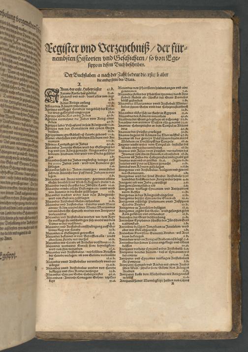 nen Samariam. Antigonus wird bei ſeinẽ Bruder Artſtobulo ver⸗ leumbdet/ kom̃tvon dem Rrieg wider heym/ 4· a⸗ 5 Antigont jᷣmmerlicher tod Antigonus verklagt vyrcanum vnd Antipatrum vorm Reyſer Antigonus in das Ronigreich eingeſetzt 16. b⸗ Antigonus beyſſet vyrcano die Ghren ab 16.4⸗ Antigonus erſchlaͤgt Ptolemeum vnnd Joſippum Verodis Bruder 17 b. Antigonus ʒu Jeruſalem belaͤgert i8. a. Antigonus ergibt ſich Soſio/ wird gefangen gehn Rom gefuͤhret/ vnd enthaubter Antiochla der Statt beſchreibung 51. b. Antiochus Epiphanes ſchaffet den Juͤdiſchen Got⸗ tesdienſt ab Antiochus beloͤgert Jonatham zu Jeruſalem/ wird aber mit Gelt abgewiſen— 3.b⸗ Antiochus Dionyſiũs/ Demetrij Bruder/ wil Ara⸗ biam betkriegen Antiochus wird im Arteg võ Arabern erſchlagẽ.y. d. Antiochus hat ſeinen Vãtter angeklagt/ vnd toͤdten helſſen Anttpater verhetzt vᷣyreanũ wider Artſtobulũ /s. a⸗ Antipater beredet Aretam/ daß er vyrcanum wi⸗ der einſetze Antipater vnd vyrcanus verklagen Ariſtobulum fuͤr Pompeo 5 Antipatri veyrath vud Rinder mit eynem Arabi⸗ ſchen Weib/ ſchicket ſeine Soͤhne dem Roͤnig in Arabien 1. be Antipater kom̃t dem Mithridatt mit Rriegsuolck zu huͤlff 12.d⸗ Antipater ſeiner Wannligkeyt baber. von Caͤſare