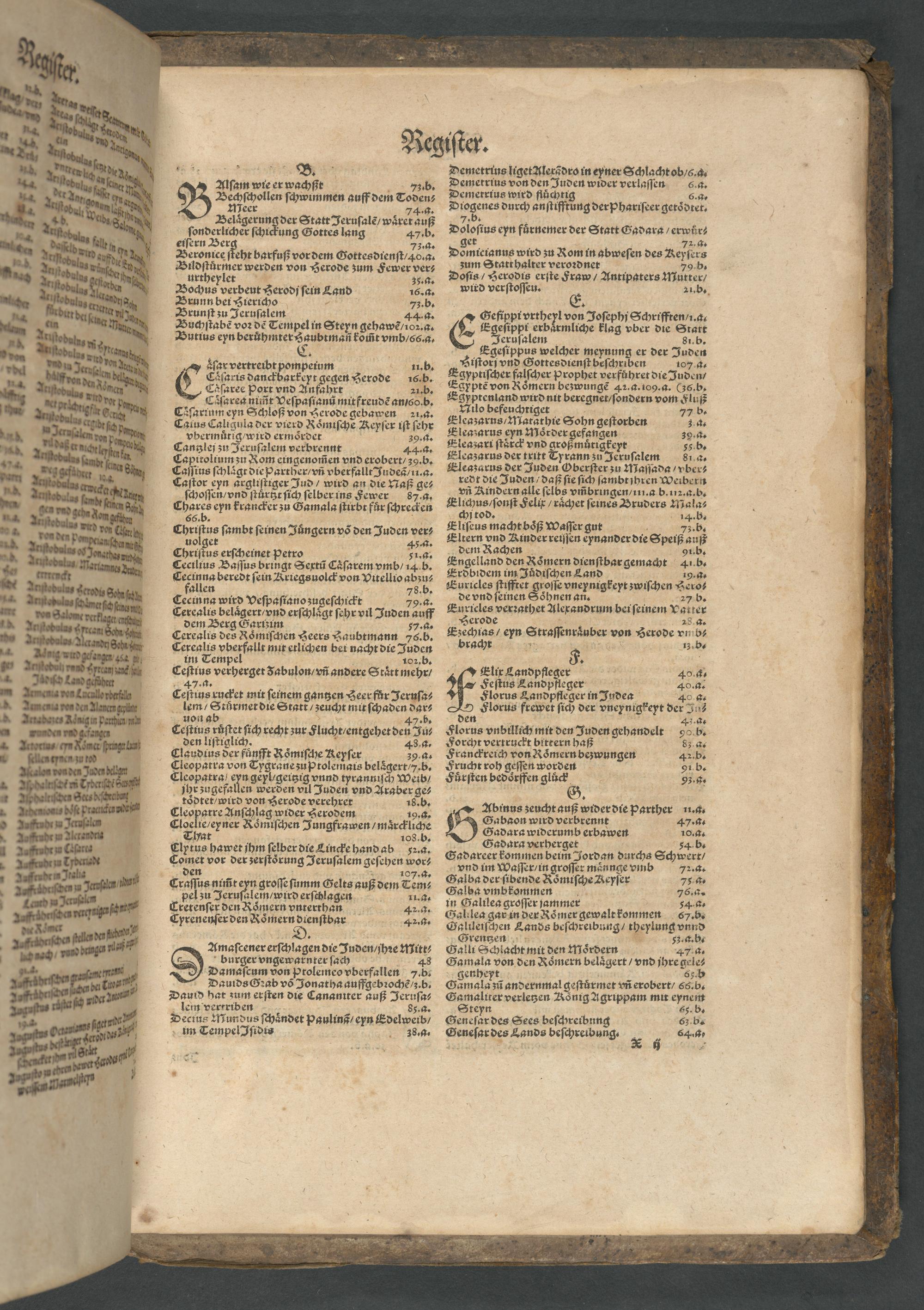ſar vertrerbt pompeium n. b. 5 Cãſaris danckbarkeyt gegen verode 16.b. Caſaree Port vnd Anfahrt 21. b. Cſarea nim̃t Veſpaſianũ mitfrendẽ an/o. b. Cãſarium eyn Schloß von verode gebawen 216. Cgius Caligula der vierd Roͤmiſche Reyſer iſt ſehr vbermuͤtig/ wird ermoͤrdet Cantzlej zu Jeruſalem verhbrennt 44.4. Capitolium ʒn Rom eingenom̃en vnd erobert/ 39. b. Caſſius ſchlãgt die Parther/ vñ vberfallt Judeq/. g. Caſtor eyn argliſtiger Jud/ wird an die Naß ge⸗ ſchoſſen/ vnd ſtuͤrtzt ſich ſelber ins Fewer 8. eyn krancker zu Gamala ſtirbt fur ſchrecken 65. b. Chriſtus ſambt ſeinen Juͤngern võ den Juden ver⸗ nolget— 454. Chriſtus erſchetnet Petro 16 Cectlius Baſſus bringt Sextũ Cãſarem vmb/ 4 b. Cecinna beredt ſein Kriegsuolck von Vitellio abʒu⸗ fallen 78.b. Cecin na wird Veſpaſiano zugeſchickt 79. 6. Cerealis belaͤgert/ vnd erſchlagt ſehr vil Inden auff dem Berg Gartzim 5. 6. Cerealis des Roͤmiſchen veers vaubtmann 76. b. Cerealis vberfallt mit etlichen bet nacht die Juden im Tempel b. Ceſtrus verherget Jabulon/ vñ andere Stoͤtt mehr/ 474. Ceſtins rucket mit ſeinem gantzen veer fuͤr Jeruſa⸗ lem/ Stuͤrmet die Statt/ zeucht mit ſchaden dar⸗ nonab 47.b. Ceſtius ruͤſtet ſich recht zur Flucht/ entgehet den Ju⸗ den liſtiglich. 48.4. Claudius der fuͤnfft Roͤmiſche Reyſer 39 4. Cleopatra von Tygrane ʒuptolemais beloͤgert/7.b. Clcopatra Ingellegeitia vnnd tyranniſch Weib/ Ihrzugefallen werden vil Juden vnd Araber ge⸗ roͤdtet/ wird von werode verehret 18. b. Eehen Anſchlag wider verodem 19,6. Cloelie/ eyner Roͤmtſchen Jungfrawen/ maͤrckliche That 108 b. Clytus hawet jhm ſelber die Lincke hand ab 5ꝛ.g. Comet vor der ʒerſtoͤrung Jeruſalem geſehen wor⸗ den 107,6. Craſſus nim̃t eyn groſſe ſumm Gelts auß dem Tem⸗ pel zu Jeruſalem/ wird erſchlagen Cretenſer den Roͤmern vnterthan Cyrenenſer den Roͤmern dienſtbar