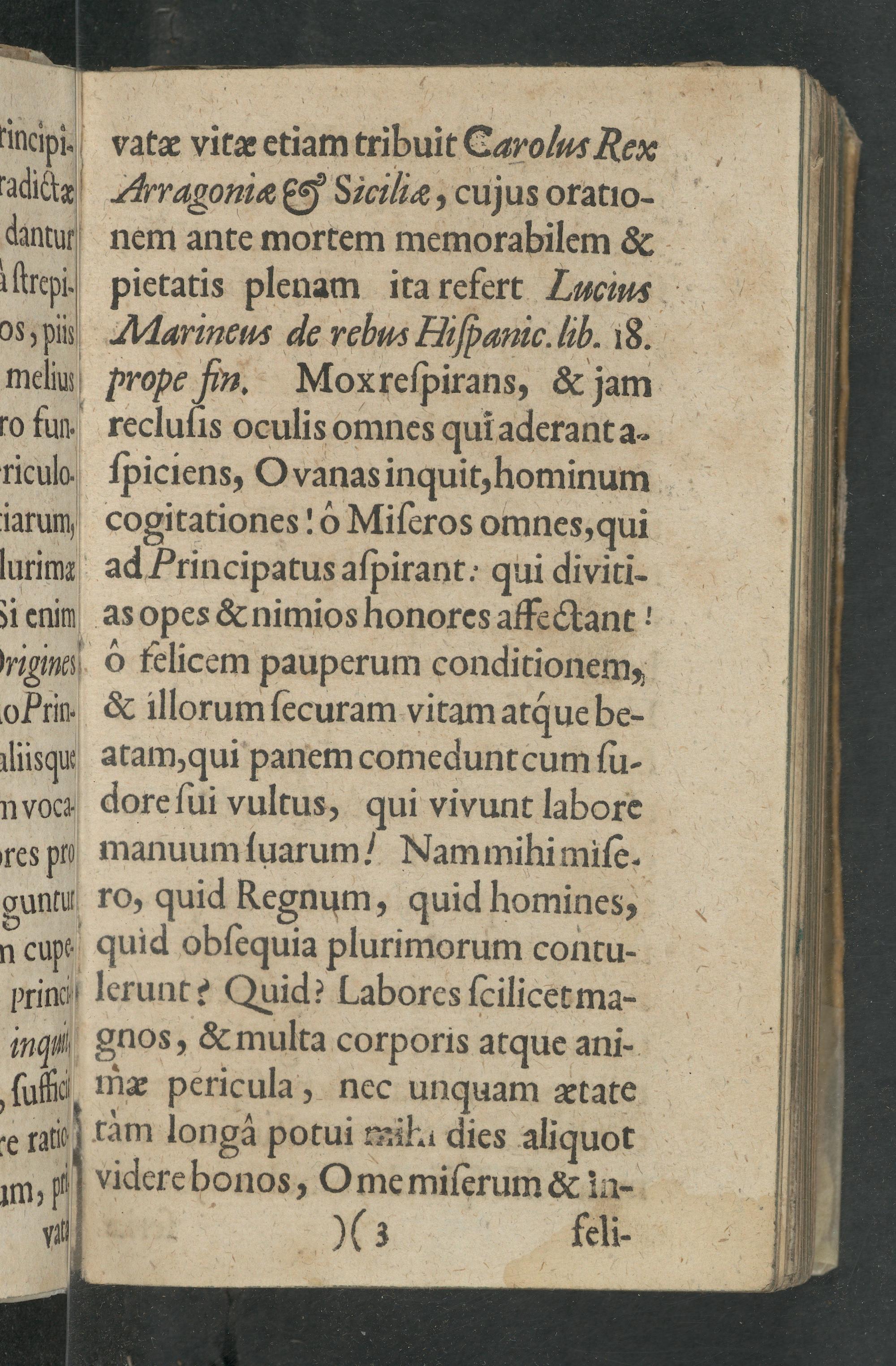 vatæ vitæ etiam tribuit GCarolus Nex Arragoniæ leh Siciliæ, cujus oratio- nem ante mortem memorabilem& pietatis plenam ita refert Lucius Marincus de rebu Aſpanic. lh. 18. hrope n. Moxreſpirans,& jam recluſis oculis omnes qui aderant a- ſpiciens, O vanas inquit, hominum cogitationes: õ Miſeros omnes, qui ad Principatus aſpirant: qui diviti as opes& nimios honores affectant ò felicem pauperum conditionem, & illorum ſecuram vitam atque be- atam qui panem comeduntcum ſu- dore ſui vultus, qui vivunt labore manuum fuarumꝰ Nammihimiſe. ro, quid Regnum, quid homines, quid obſequia plurimorum contu-